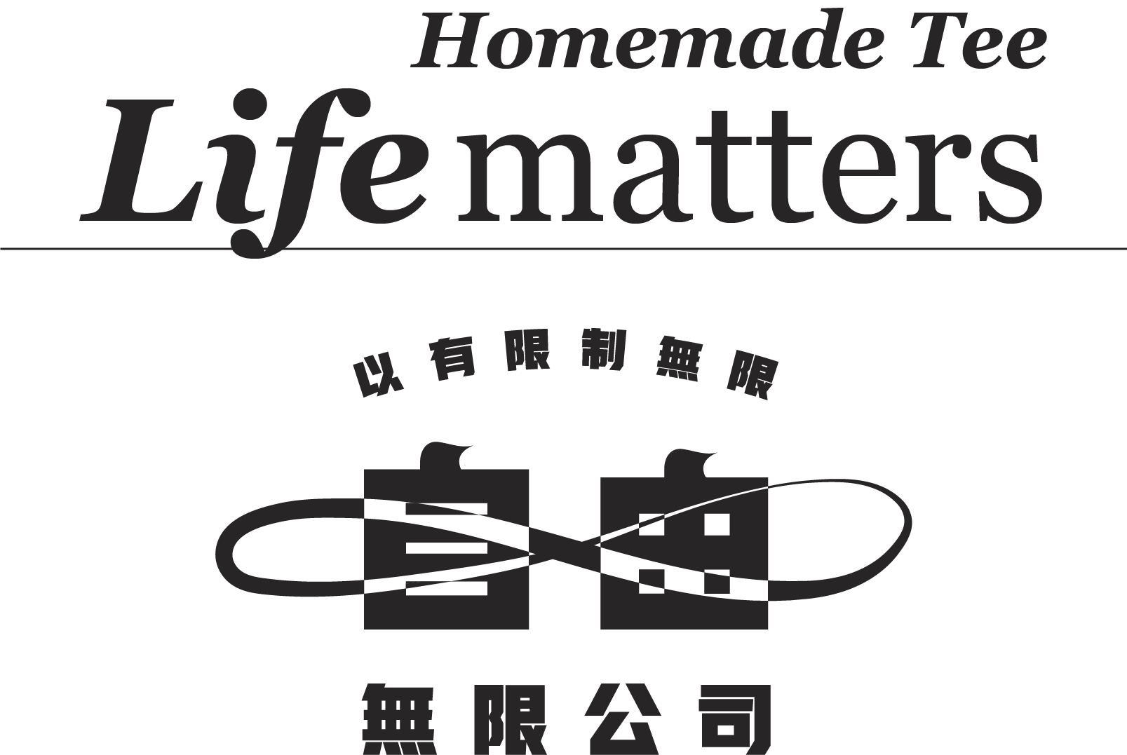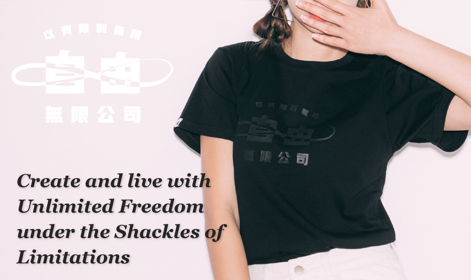 無限Infinity標誌與自由兩字重疊,乍看是綑綁,是枷鎖,實為無限之意。希望在有形的枷鎖下,製造和活出無限自由。