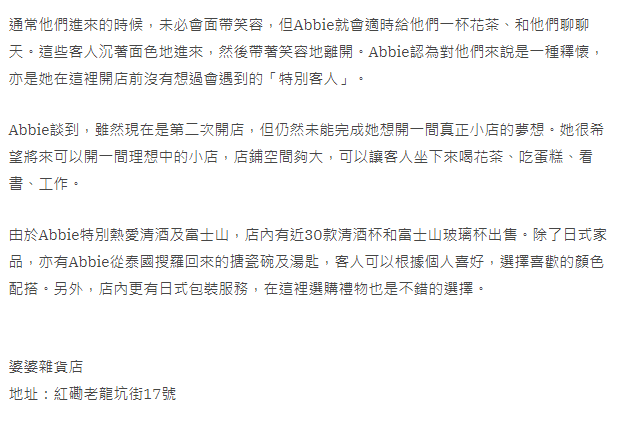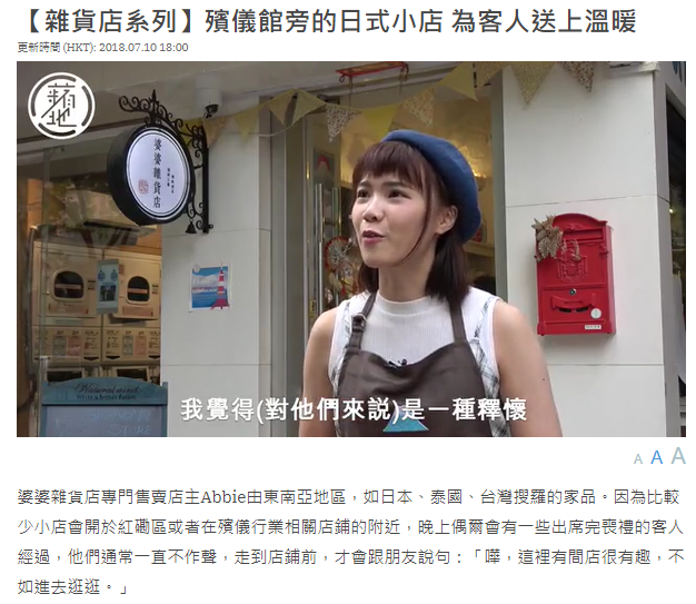 婆婆雜貨店專門售賣店主Abbie由東南亞地區,如日本、泰國、台灣搜羅的家品。因為比較少小店會開於紅磡區或者在殯儀行業相關店鋪的附近,晚上偶爾會有一些出席完喪禮的客人經過,他們通常一直不作聲,走到店鋪前,才會跟朋友說句:「嘩,這裡有間店很有趣,不如進去逛逛。」