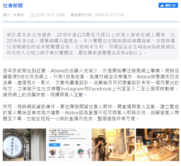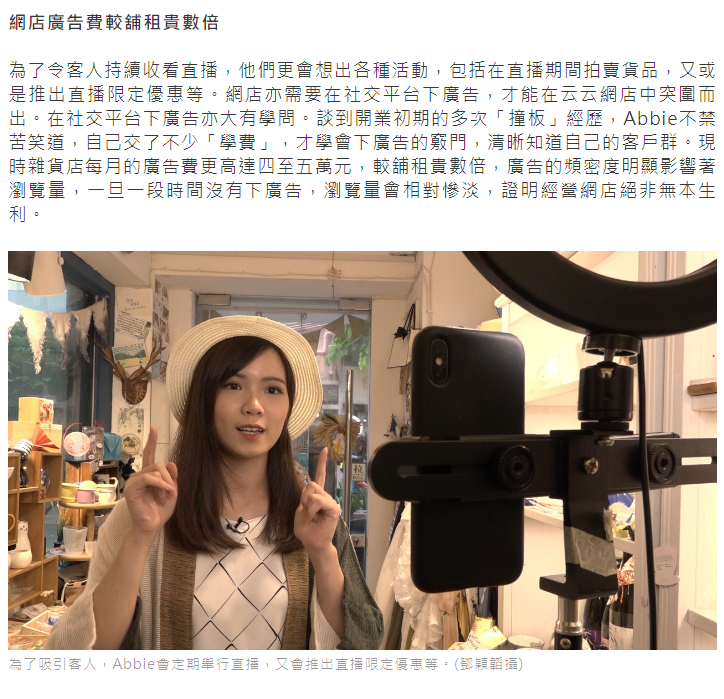 統計處早前公布調查,2018年逾220萬名15歲以上的港人曾經在網上購物,比2016年多3成。隨著網購日趨普及,不少實體店也開始發展網購吸客。坊間普遍以為開網店的成本較實體店低,尤如無本生利,但精品店店主Abbie指經營網店所花的人力物力絕不遜於實體店,廣告費更達實體店店租4倍以上。