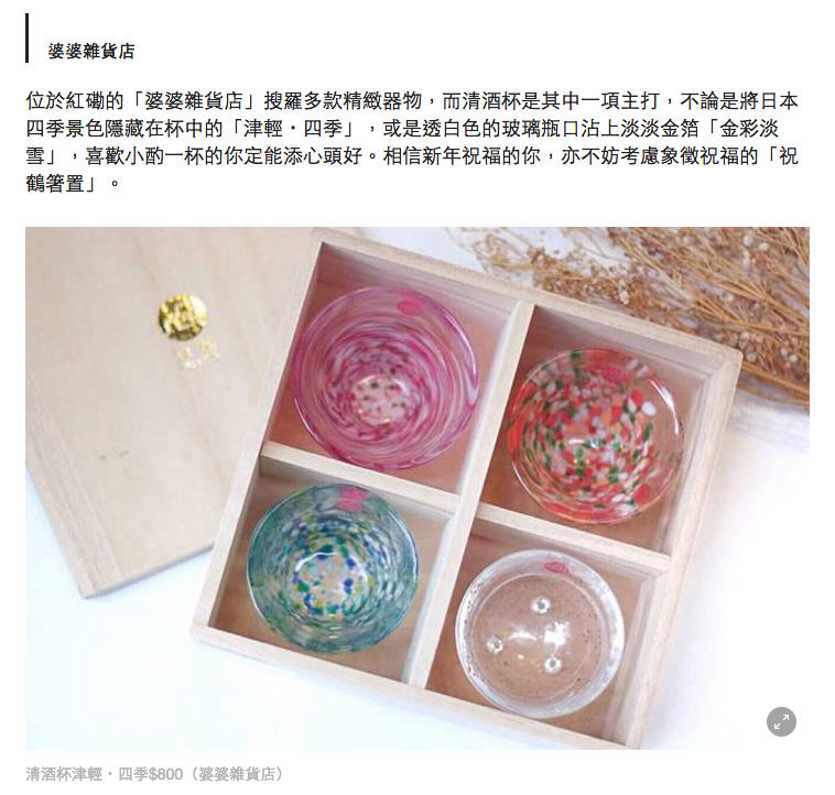 位於紅磡的「婆婆雜貨店」搜羅多款精緻器物,而清酒杯是其中一項主打,不論是將日本四季景色隱藏在杯中的「津輕・四季」,或是透白色的玻璃瓶口沾上淡淡金箔「金彩淡雪」,喜歡小酌一杯的你定能添心頭好。相信新年祝福的你,亦不妨考慮象徵祝福的「祝鶴箸置」。