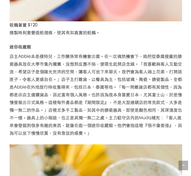 「當你出國旅遊,如到台灣或日本,你會特意去探訪一間小店或咖啡店,坐上一整天,但在香港你只會順便去逛逛某店,卻從來不會抽時間去到訪某一間店子。」Abbie指,曾有客人特意抽時間到訪,在店裡花上一小時與她談天,令她十分滿足。「我對生活很敏感,常會留意物件的細節,因此也希望引導客人去留意和欣賞物件的細節,讓他們進來可放鬆一點,慢活一下。我希望可把這兒打造成一個城裡的後花園、休息室,是一個讓人聚頭的地方,接下來也會邀請手作人辦一些工作坊,同時為店子增添更多手藝品。」她又指,每間不同的小店都反映了店主的個人習慣與性格,各有特色,也是獨一無二、無法取替的;希望香港可有更多此類店子,百花齊放,為城市增添色彩。