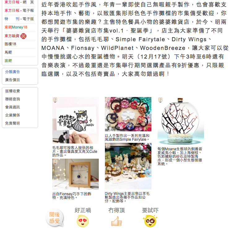 近年香港吹起手作風,年青一輩即使自己無暇親手製作,也會喜歡支持本地手作、藝術,以致匯集形形色色手作攤檔的市集備受歡迎,你都想閒遊市集的樂趣?主售特色餐具小物的婆婆雜貨店,於今、明兩天舉行「婆婆雜貨店市集vol.1.聖誕季」,店主為大家準備了不同的手作攤檔,包括毛毛聊、Simple Fairytale、Dirty Wings、MOANA、Fionsay、WildPlanet、WoodenBreeze,讓大家可以從中慢慢挑選心水的聖誕禮物。明天(12月17號)下午3時至6時還有音樂表演,不過最重還是市集舉行期間選購產品有9折優惠,只限親臨選購,以及不包括寄賣品,大家萬勿錯過啊!