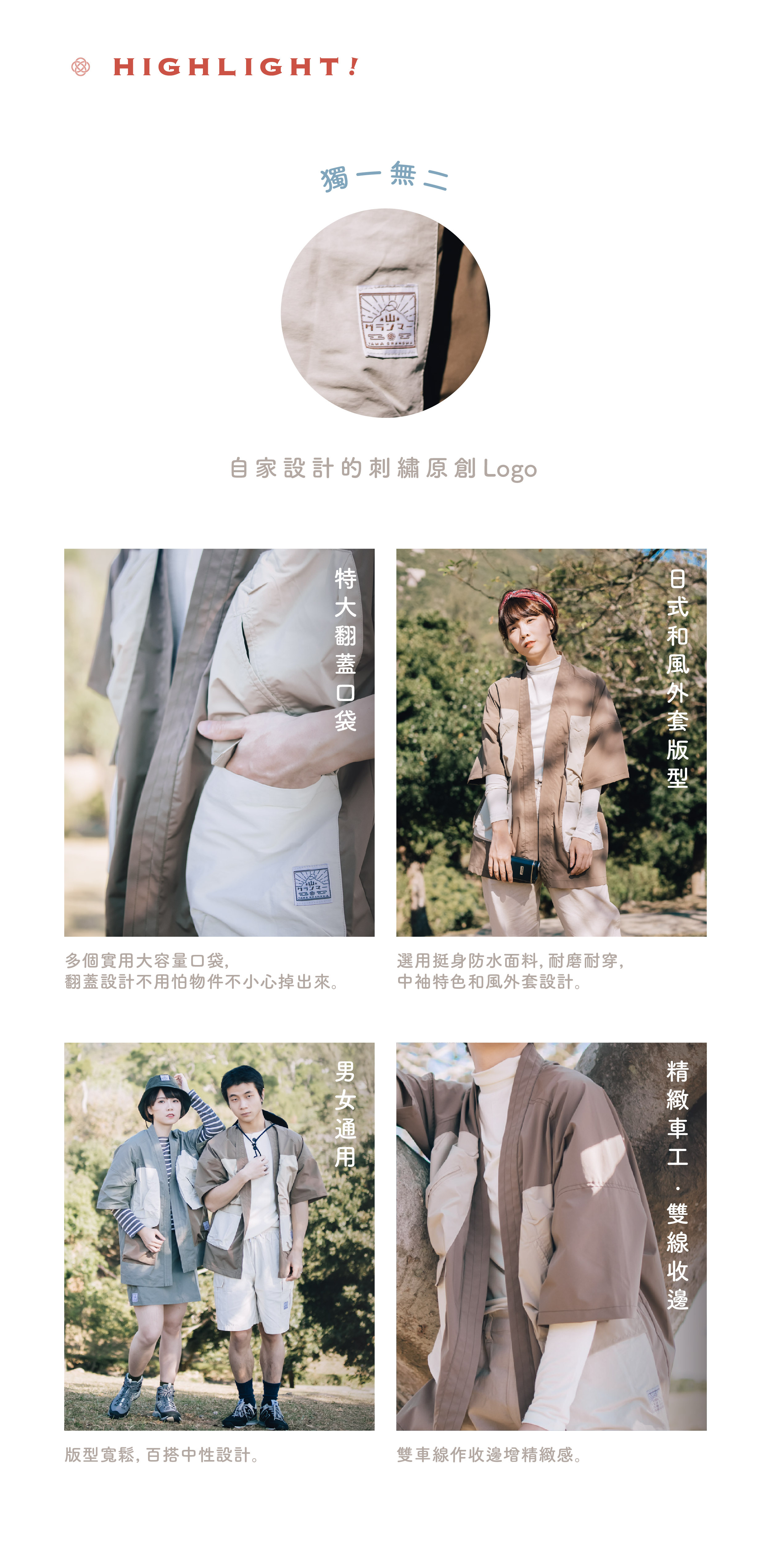 選用挺身輕防水面料,耐磨耐穿,中袖特色和風設計;保留着傳統日式結構,設有大容量口袋方便實用,不怕隨身物掉出,讓你無牽無掛,防水物料透氣快乾,為你遮風擋雨,無懼攀山涉水。