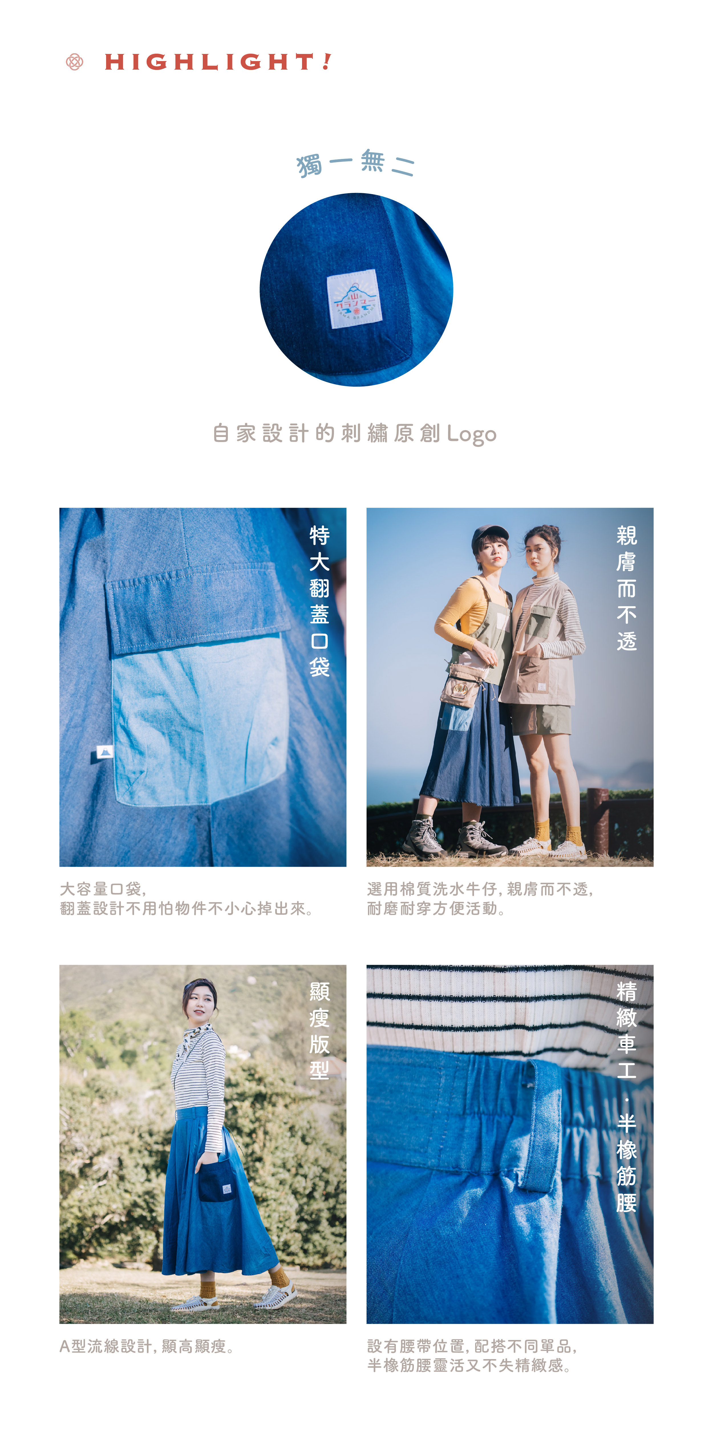 A型流線設計,融入日常風格,時尚易襯;配有翻蓋口袋,不怕隨身物掉出。選用棉質洗水牛仔,耐磨耐穿,方便活動。