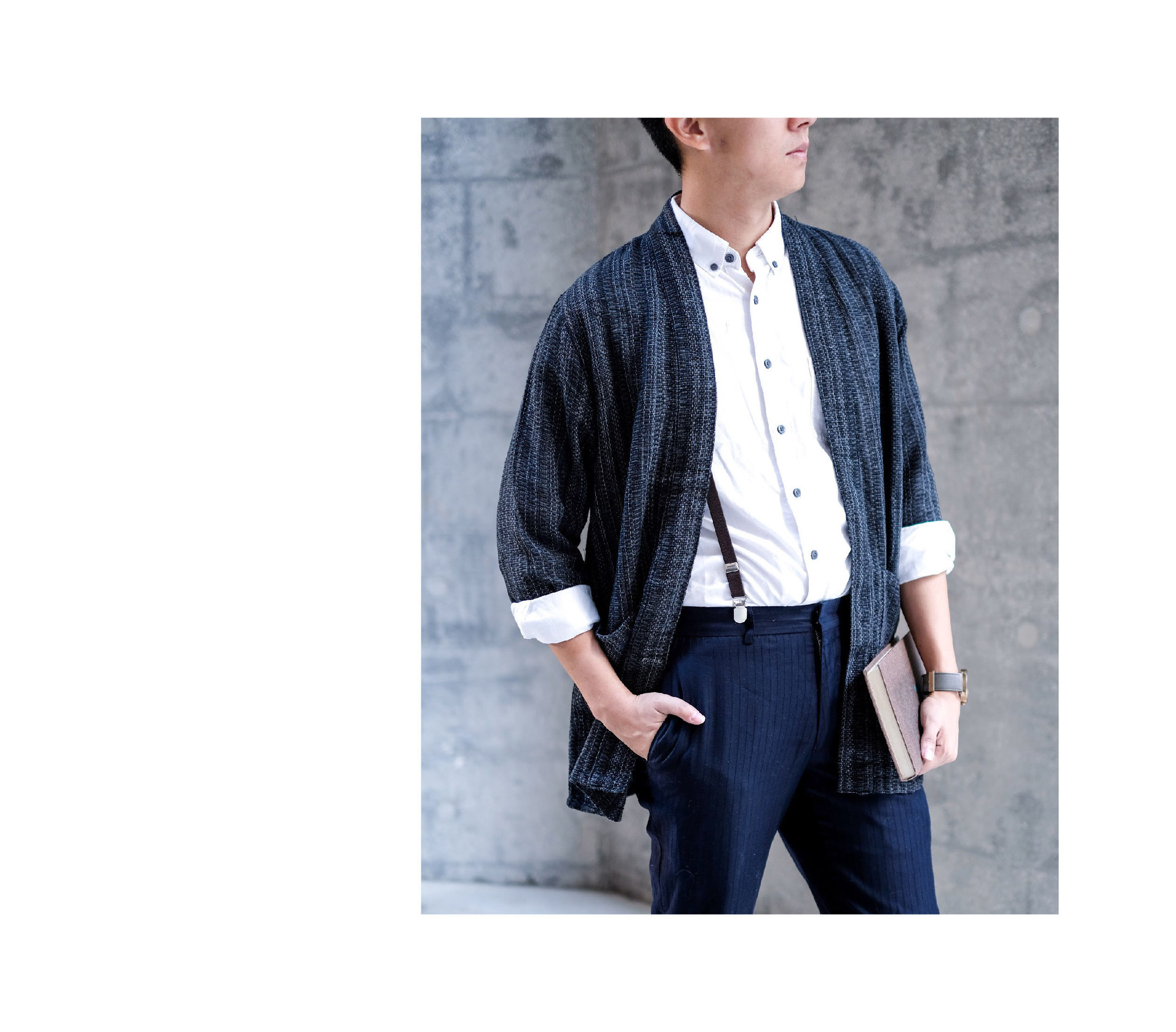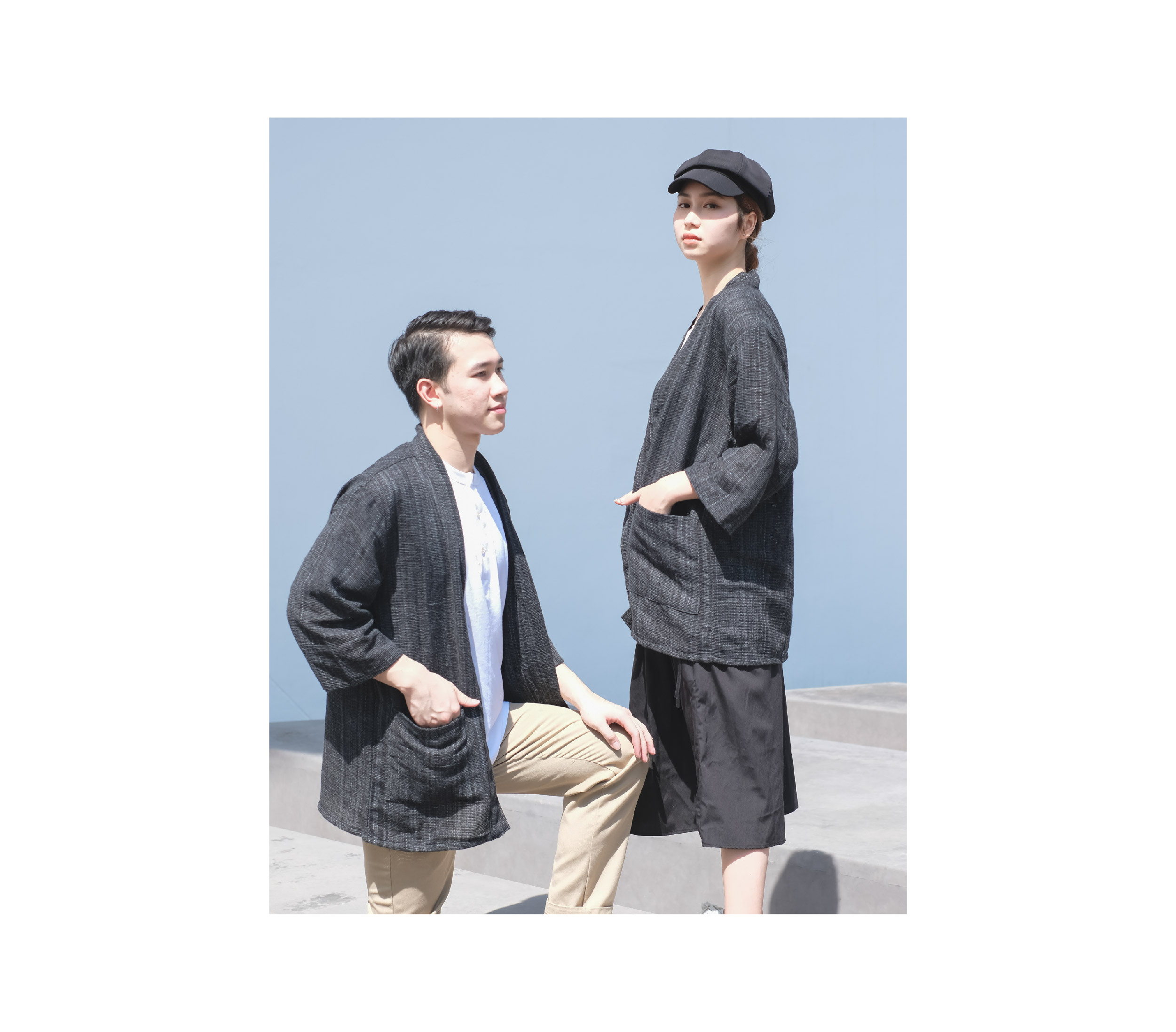這次外套以黑沙海灘‧三保松原為題,漆黑的色調配搭日本風情,不同環境造就黑系獨有層次,文青風、暗黑系、搭襯黑皮鞋、黑色浪漫主義,型格易襯。 手搖線由棉花搓捻成線,全人手梭織製成,做工細緻。製作過程極花時間和心力,由於難以量產,極其珍貴。
