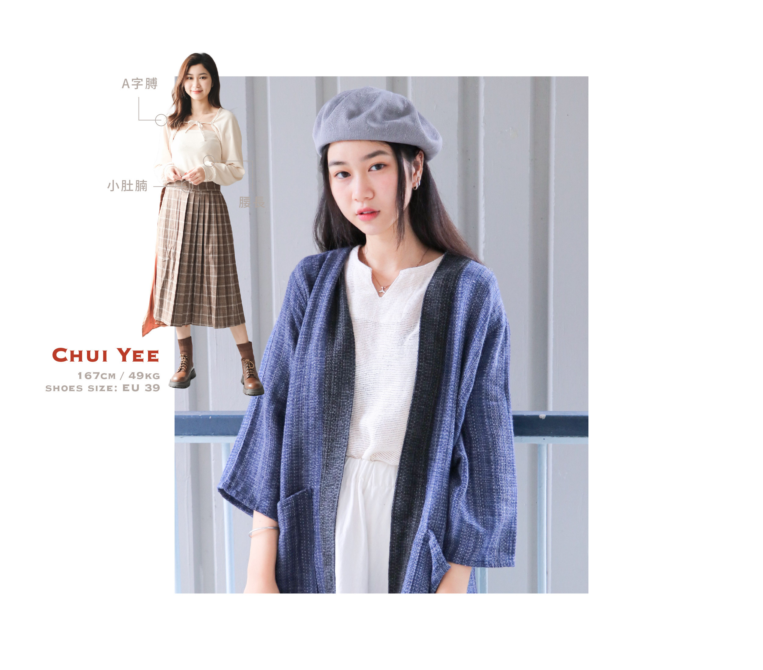 外套以月夜藍和黑色配搭,顏色素雅,百搭易襯,完美展現日系和風的版型,配以七分袖及寬鬆的設計,修飾身型之餘還增添自然隨性的感覺,集風情文化潮流於一身。
