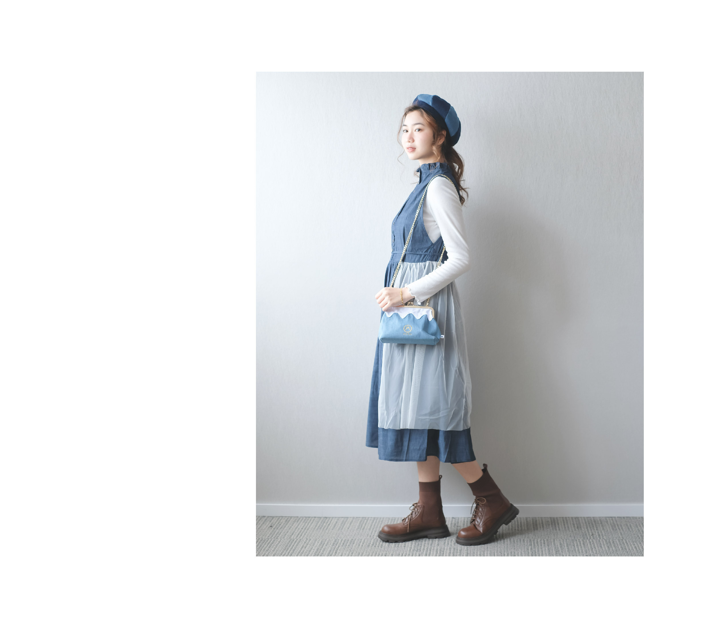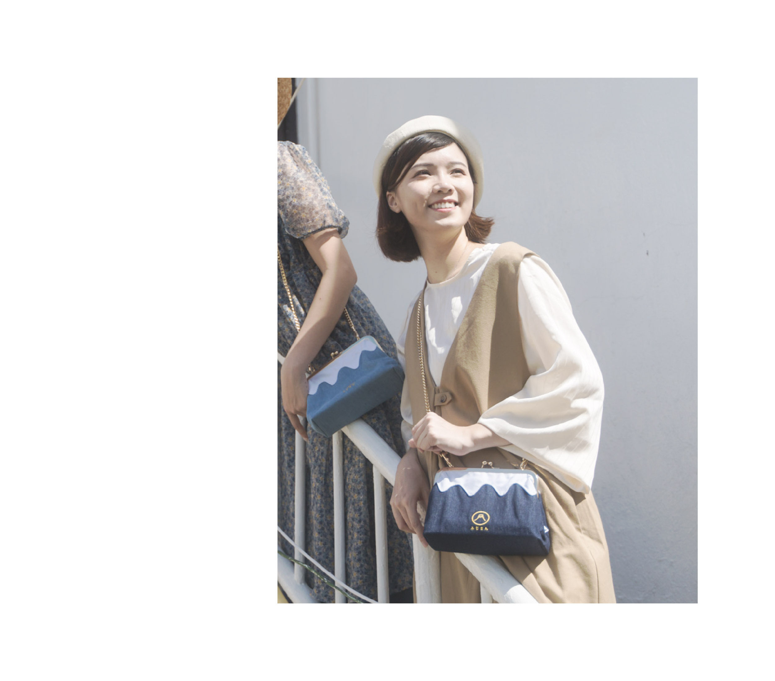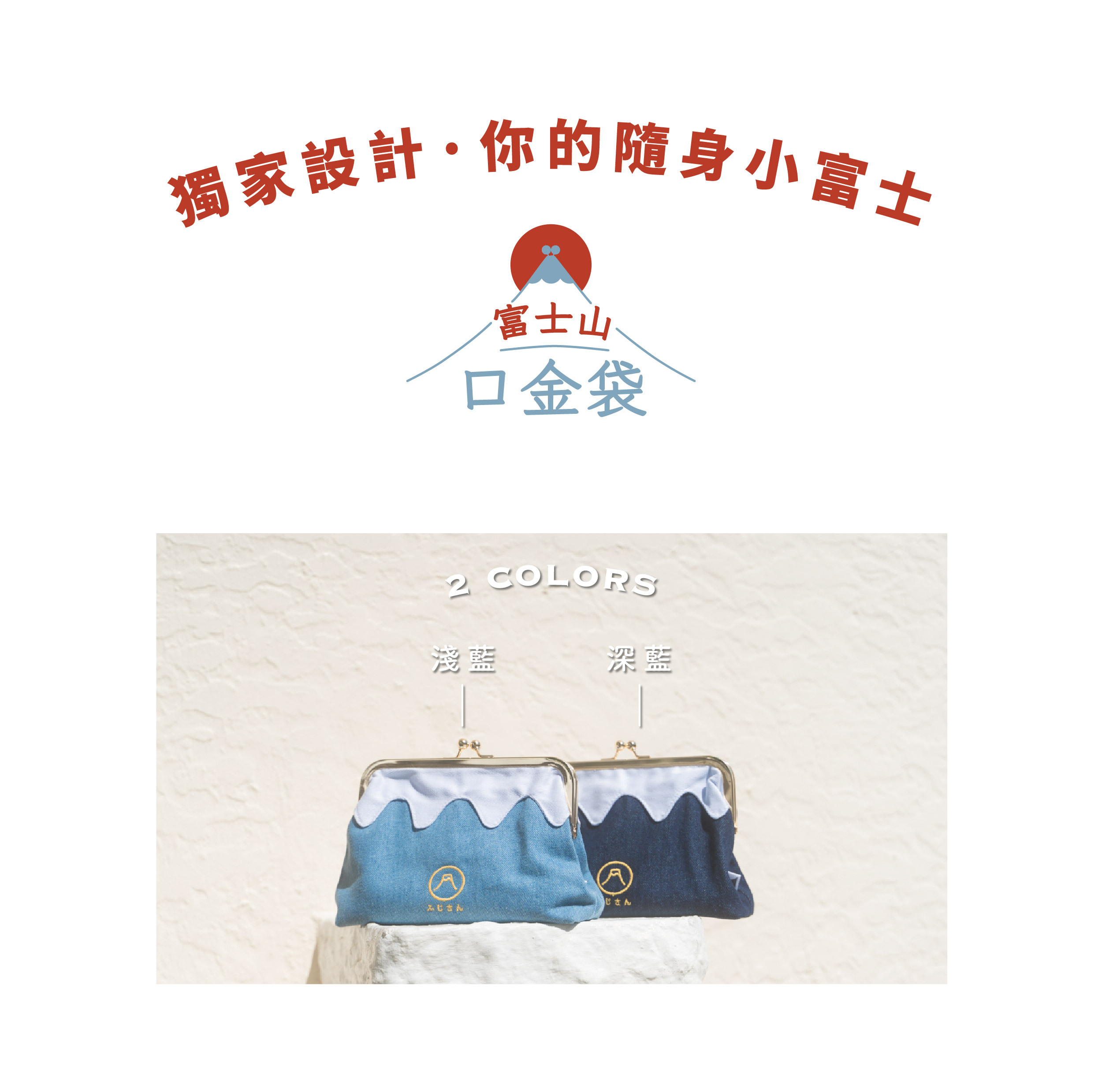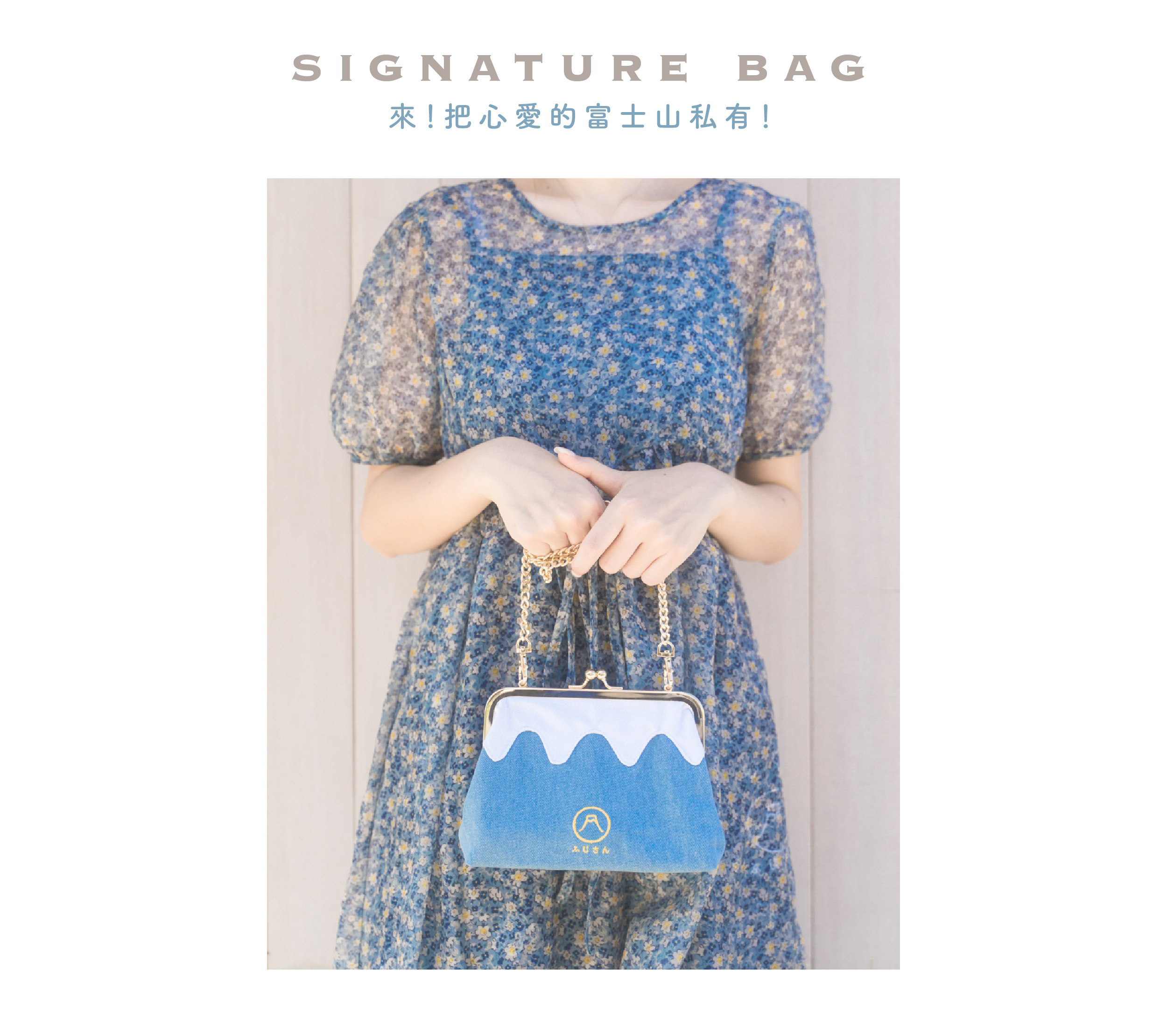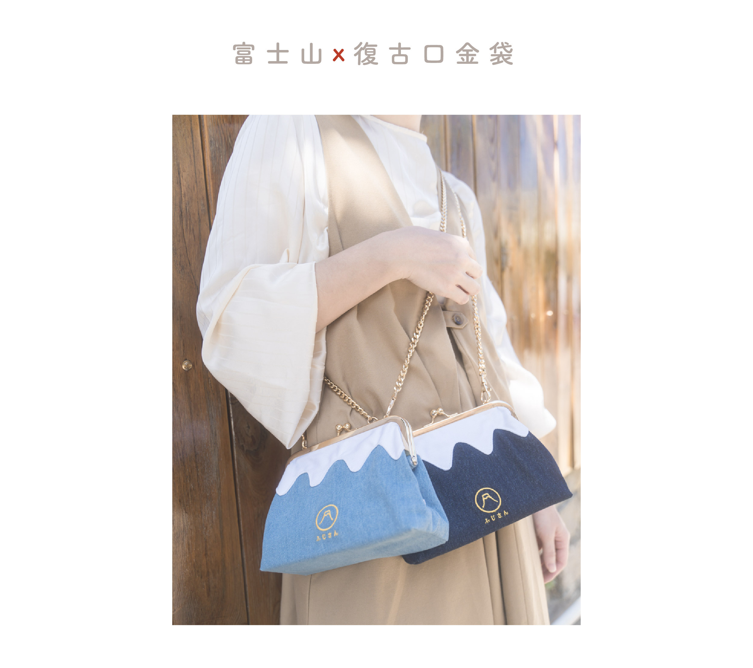 雪白的布料以彎曲的線條分隔富士山峰上,想像帶著婆婆自家製的口金袋,慢走於富士山路,欣賞沿路景致,製造回憶。