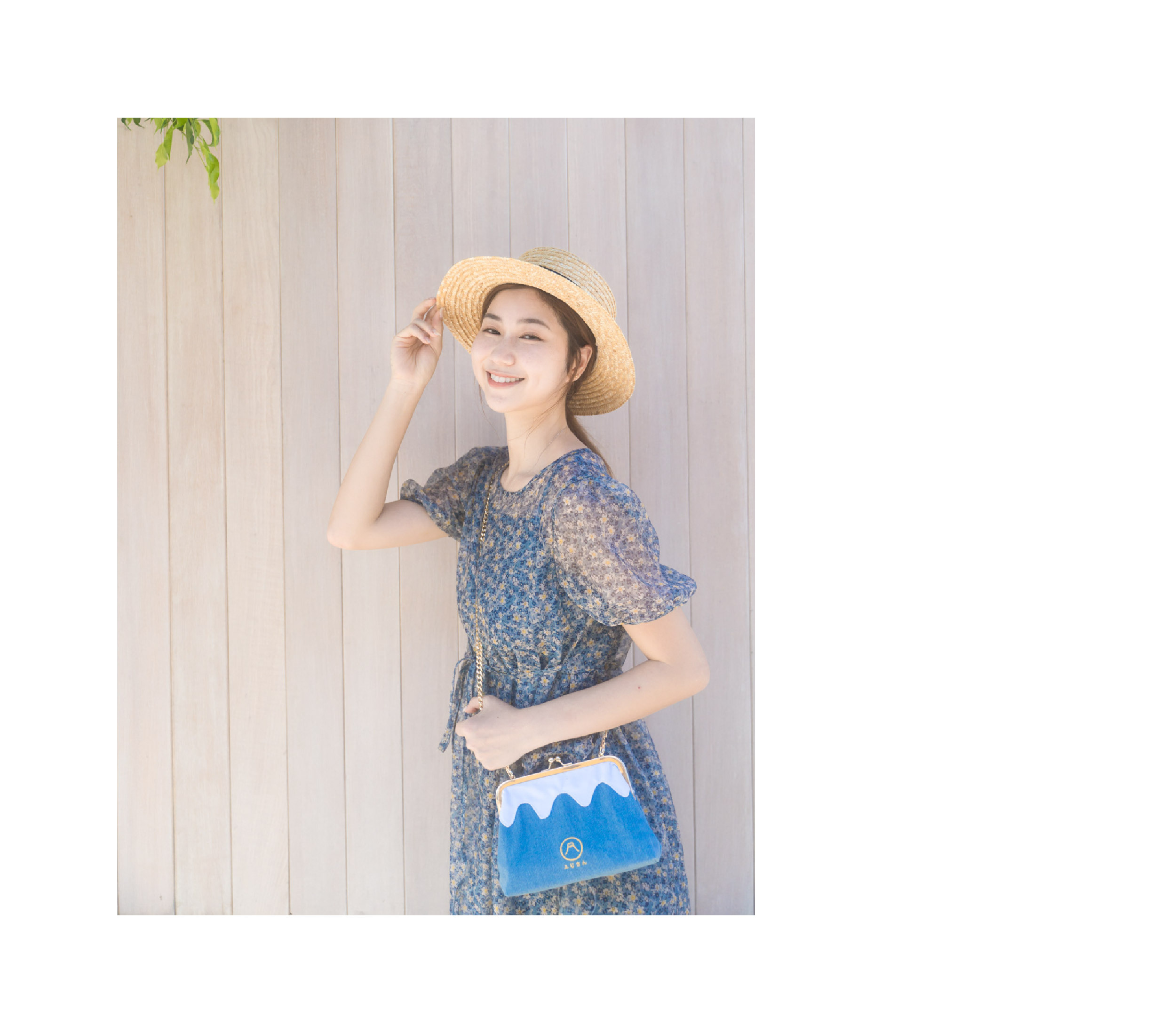 The snow-white fabric separates the peaks of Mount Fuji with curved lines. Imagine taking a pocket gold bag made by grandmama, walking slowly on the Mount Fuji road, enjoying the scenery along the road, and creating memories.