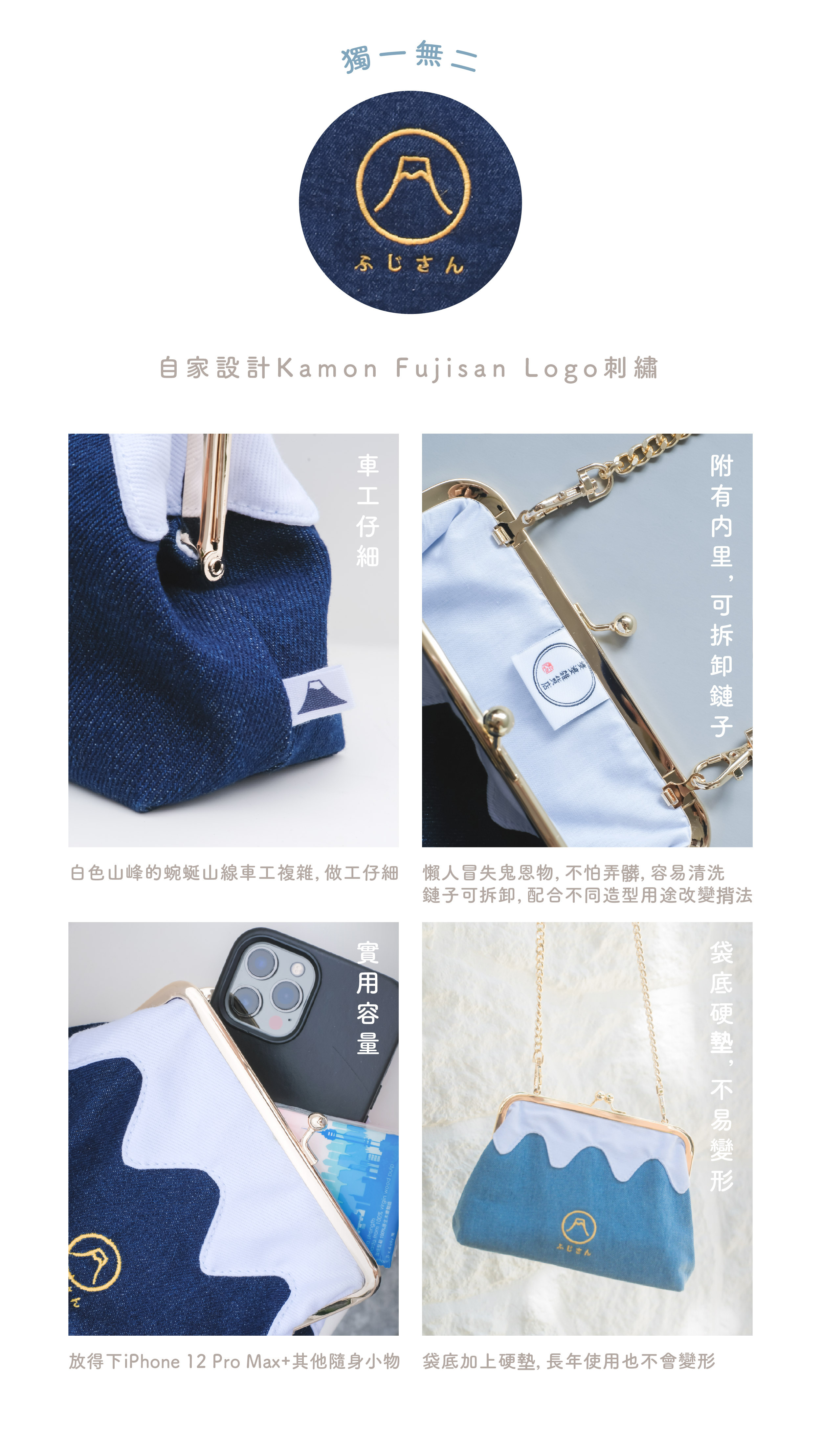 使用優質洗水牛仔布製作,外觀顏色會隨著時間變化,如同口金袋經歷時代的變幻,具備更獨有的風格。富士山口金袋放下iPhone 12 Pro Max後,還有不少空間放其他隨身小物,作為你的隨身小包最適合不過