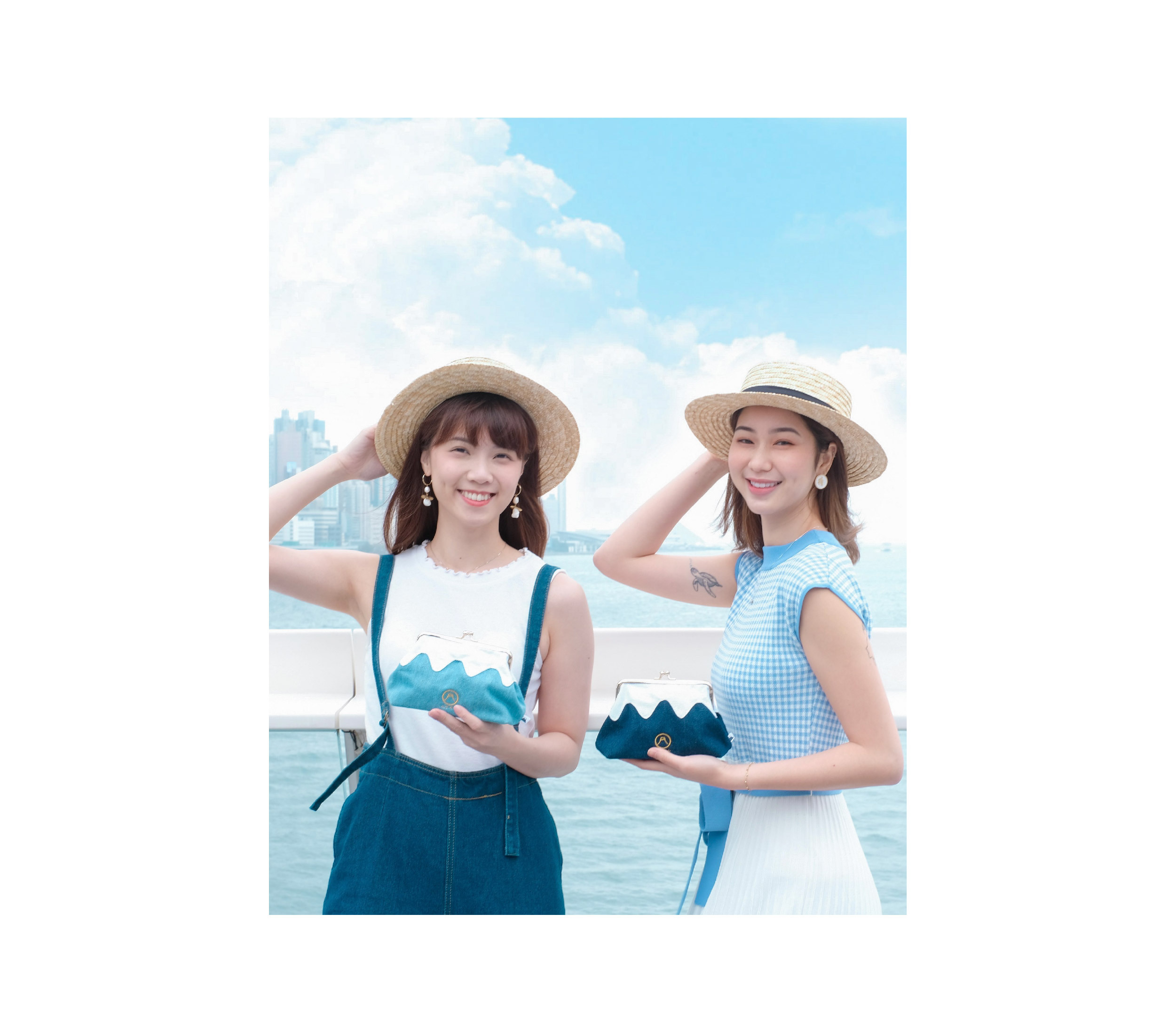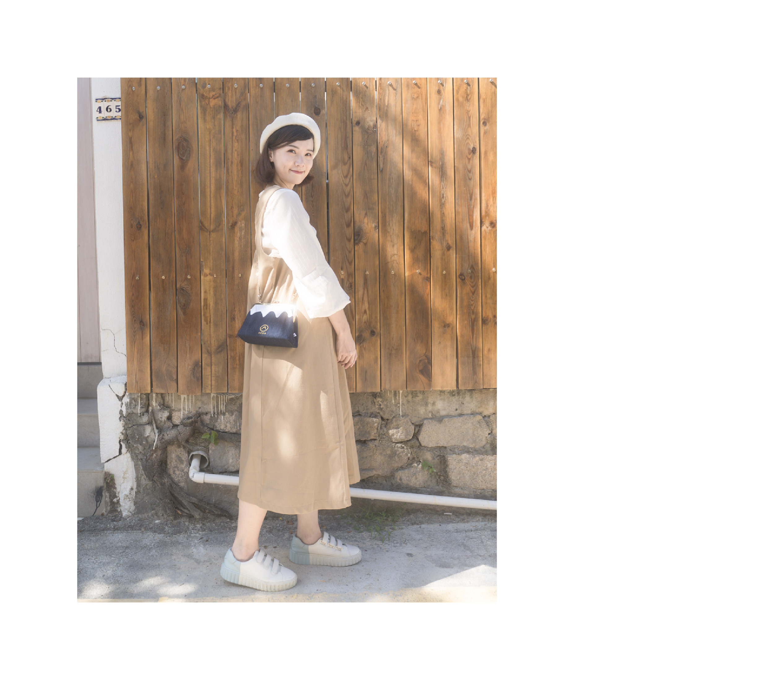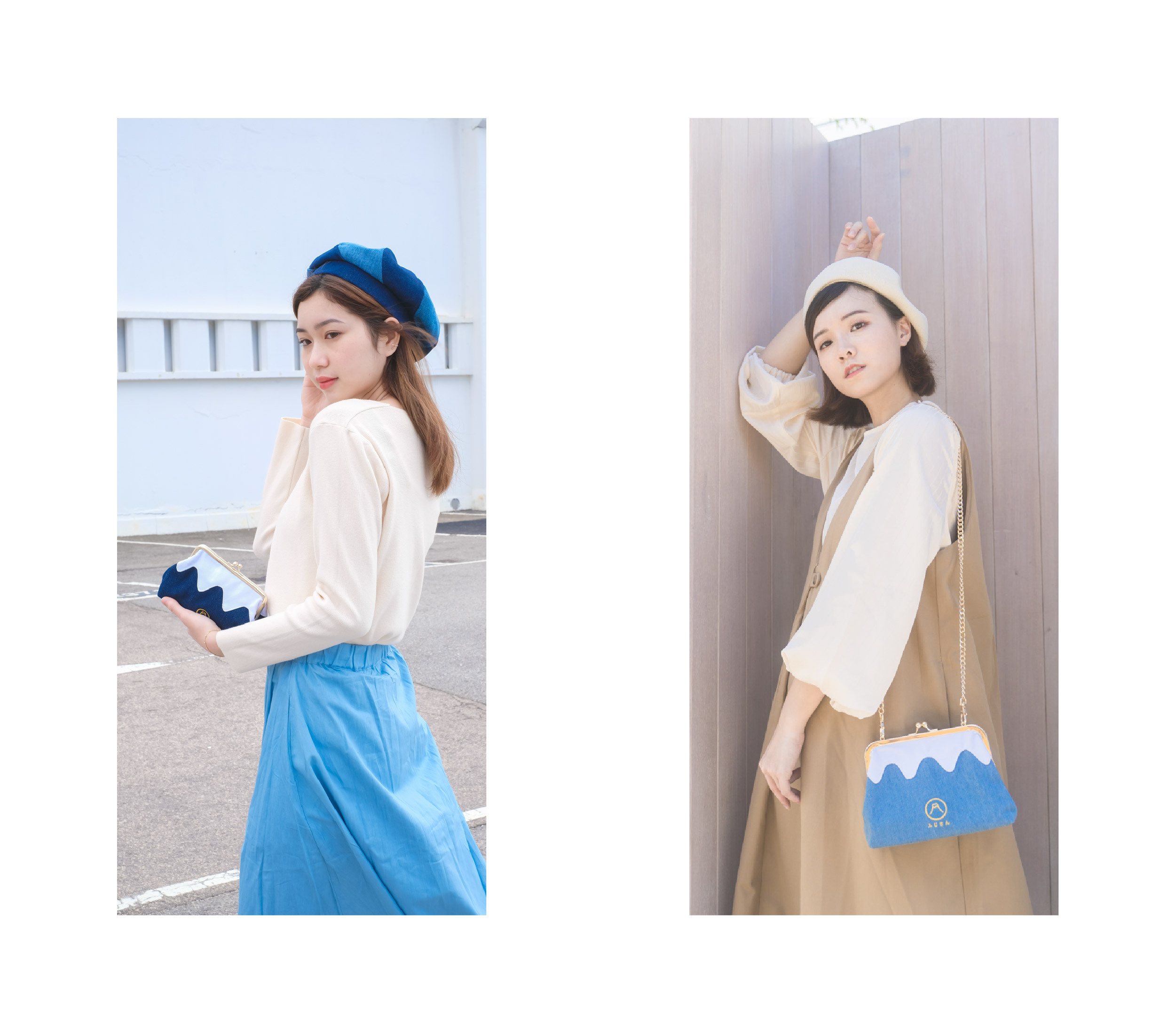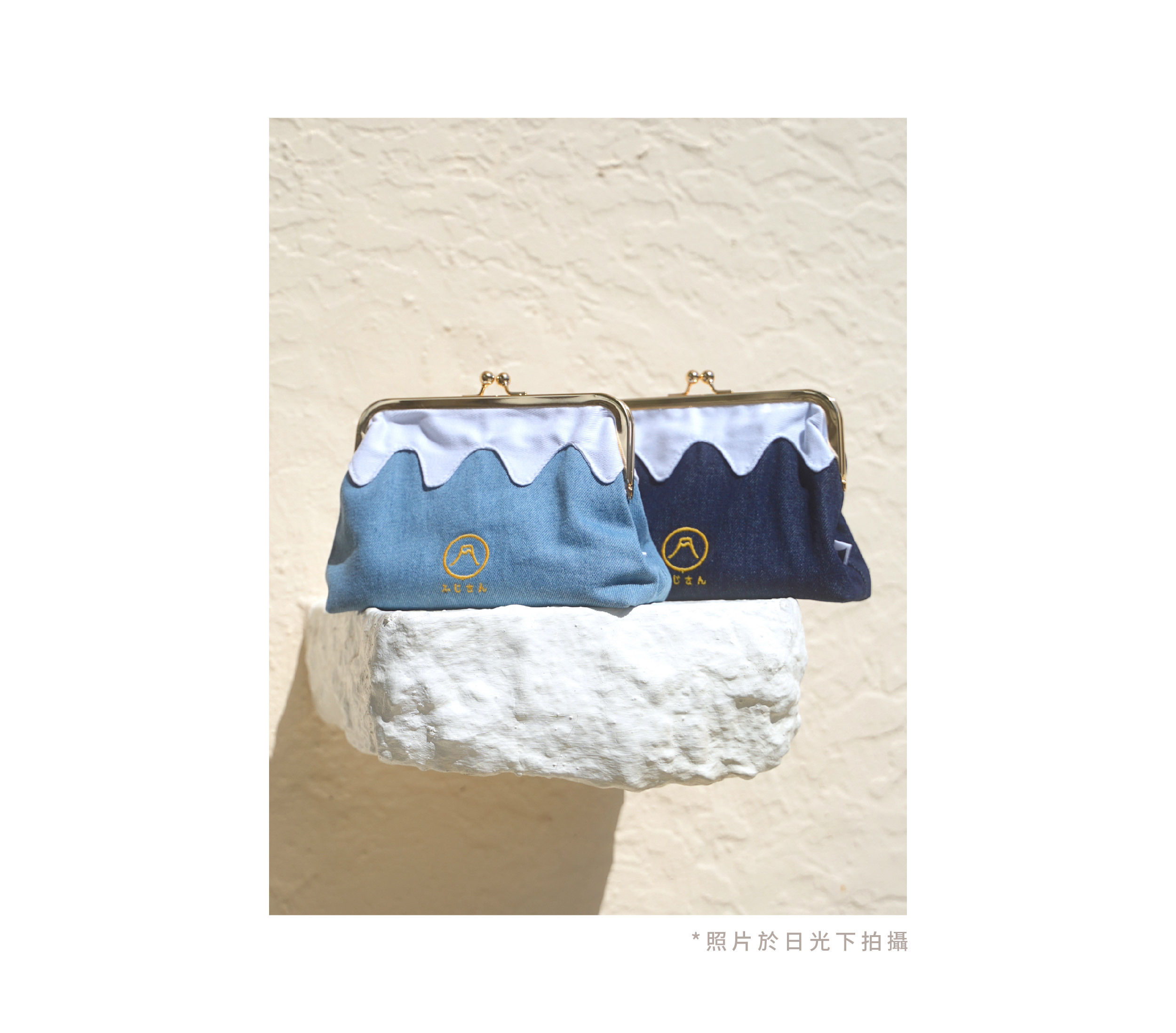 雪白的布料以彎曲的線條分隔富士山峰上,想像帶著婆婆自家製的口金袋,慢走於富士山路,欣賞沿路景致,製造回憶。