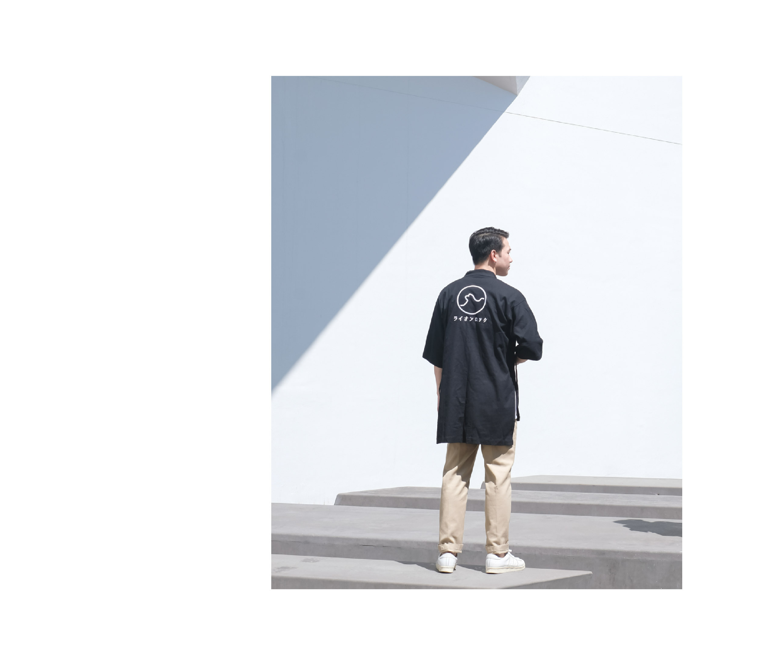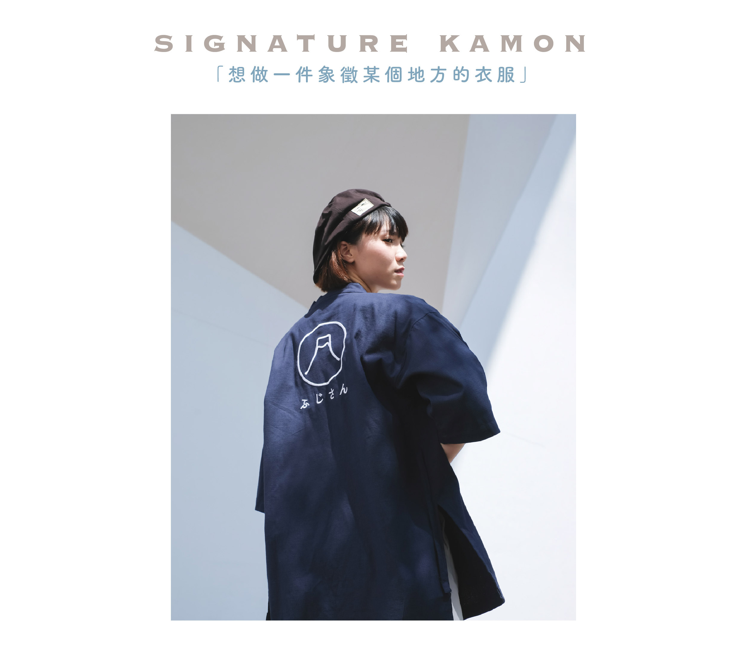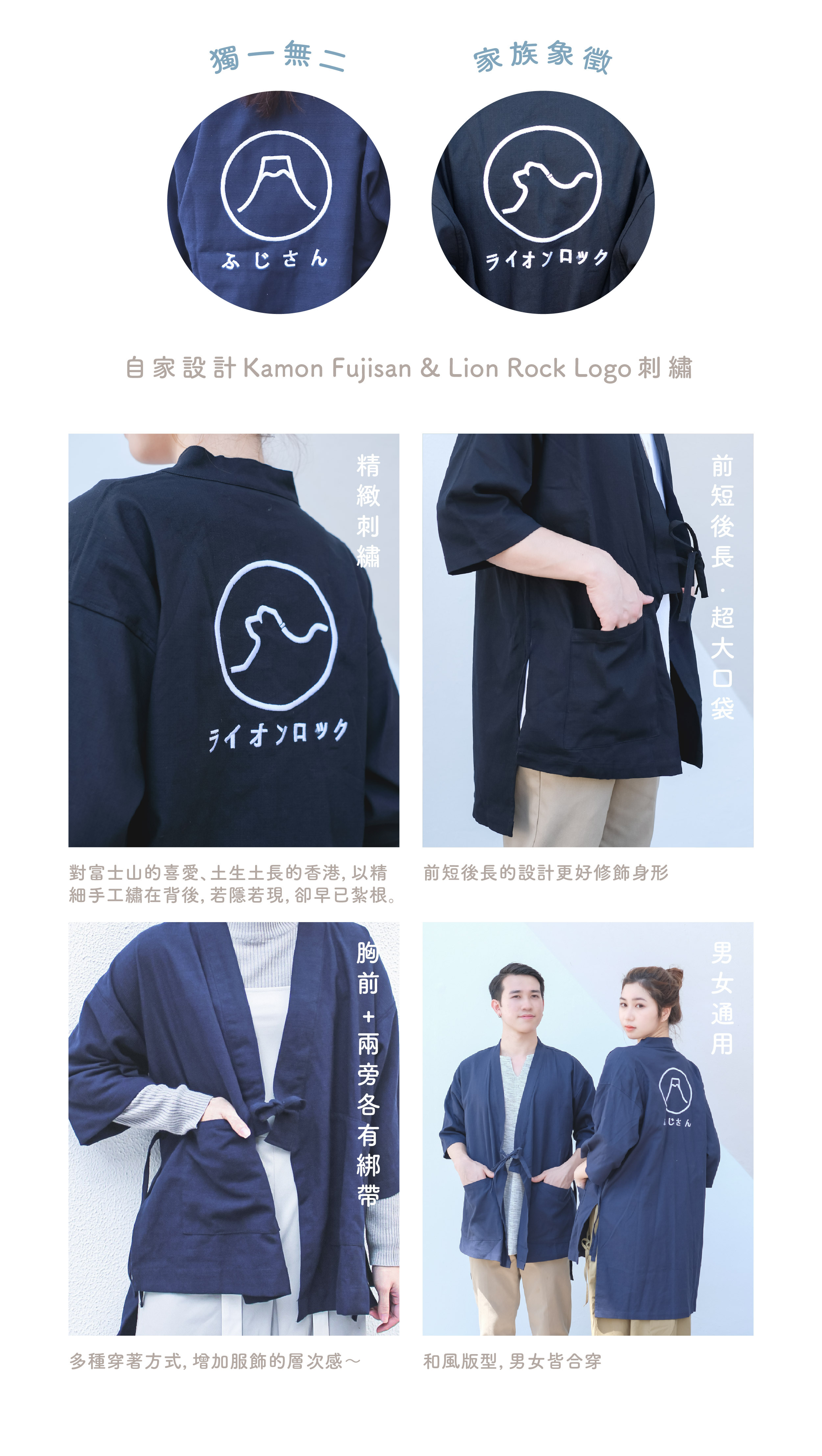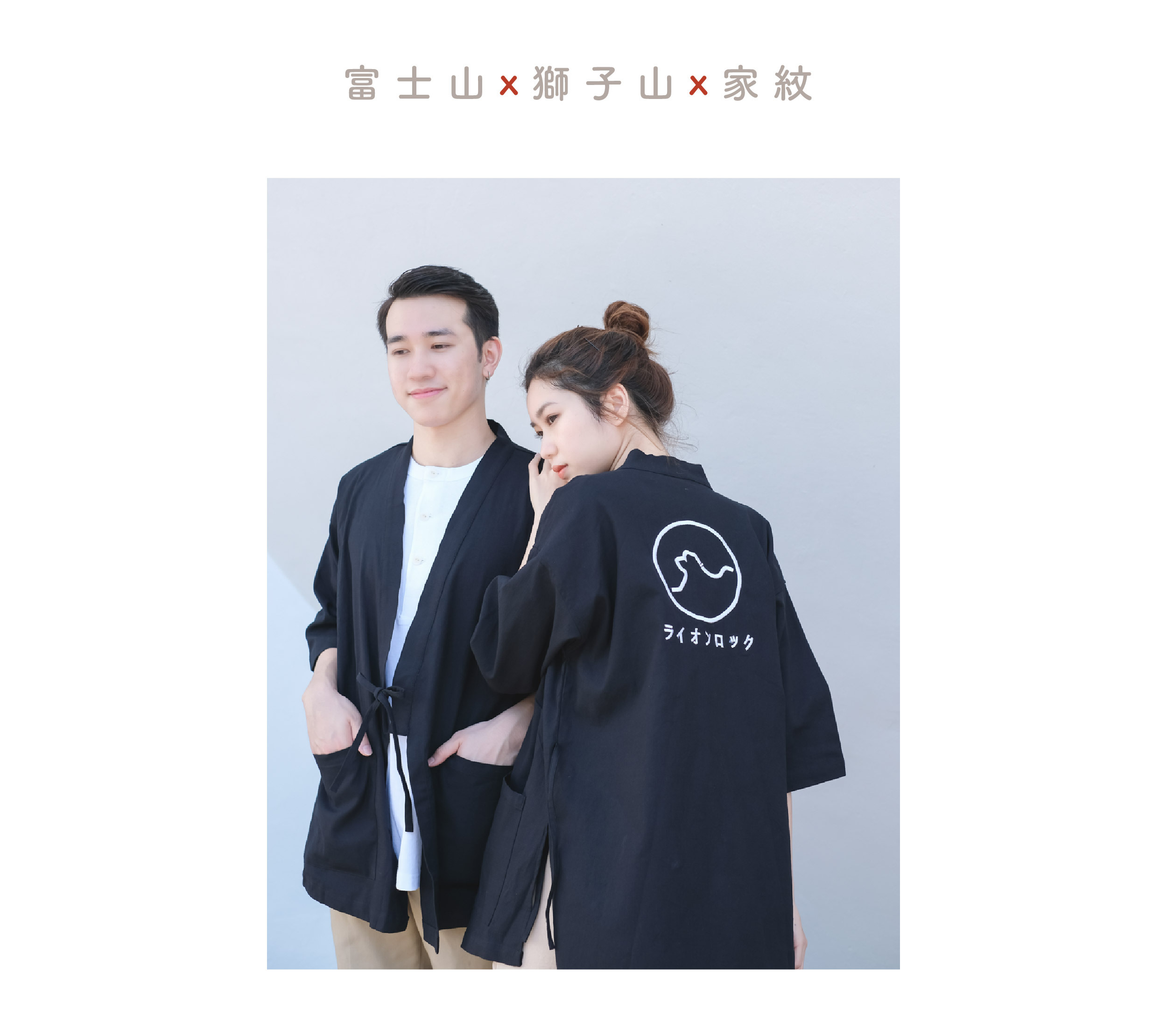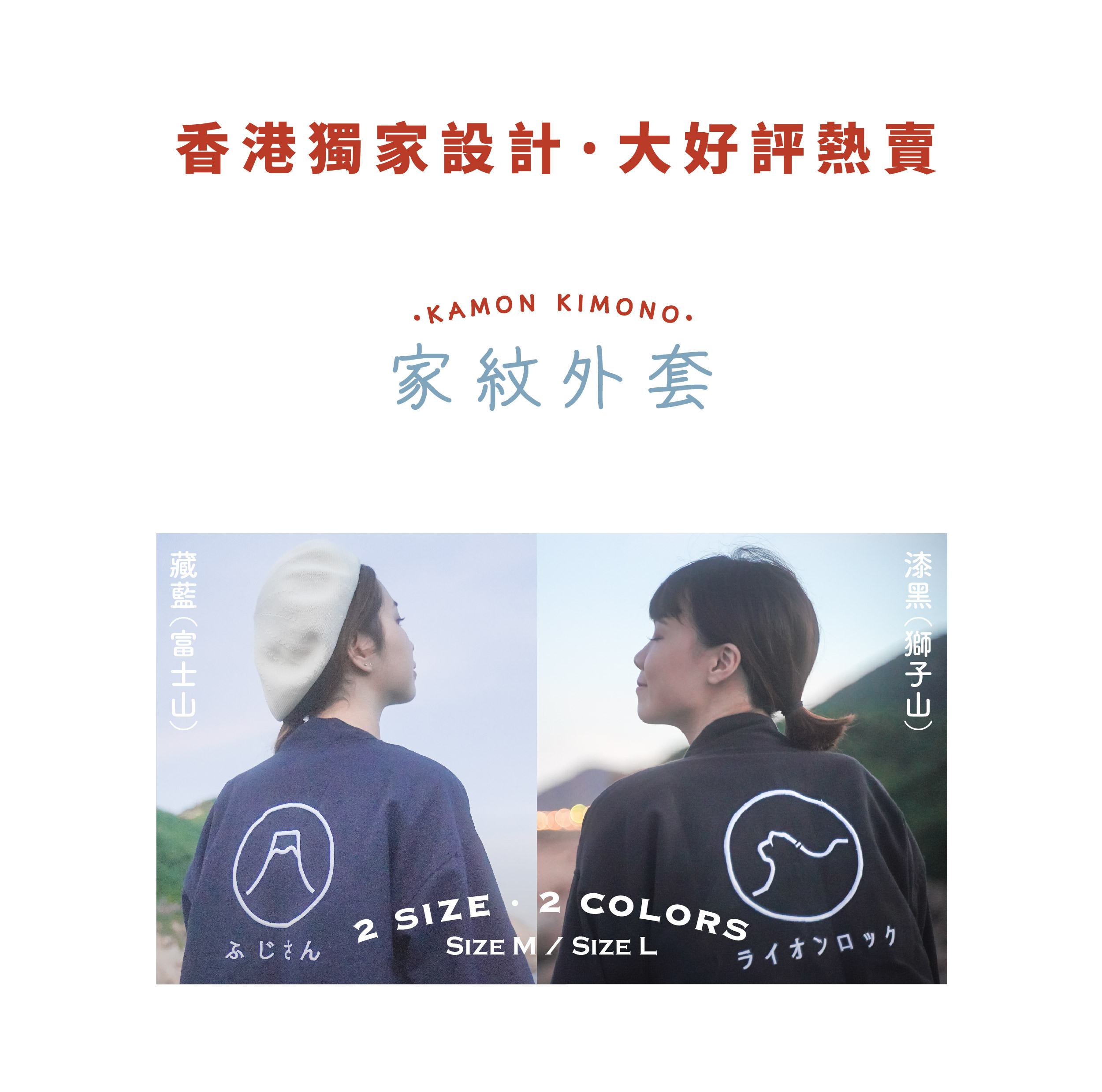 本系列以日本家紋(かもん )為靈感,融合本土象徵—獅子山和日本「聖岳」—富士山,推出兩款Kamon和風家紋外套。外套採用經典職人服的版型,加上自家設計的Kamon Logo刺繡,重現日本傳統工作服飾,兩側開叉的時尚設計,能好好修飾版型,適合都市人穿著。