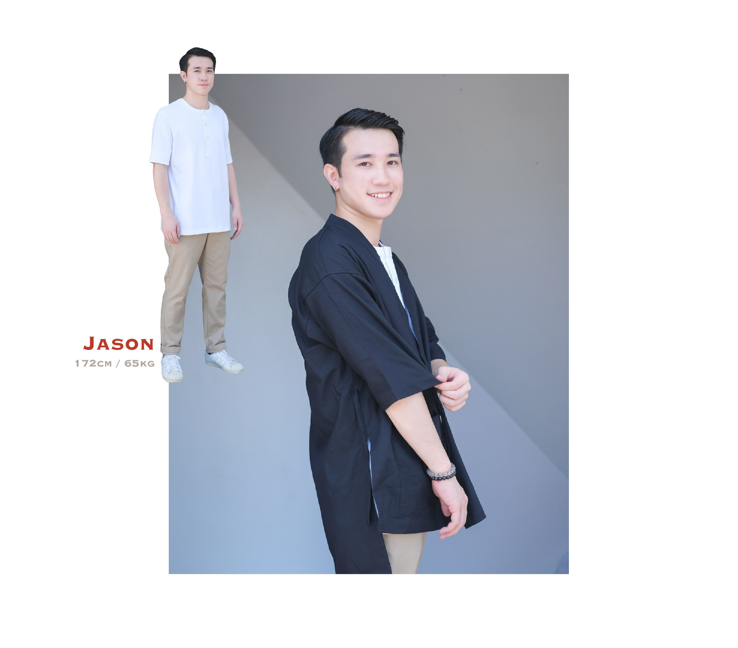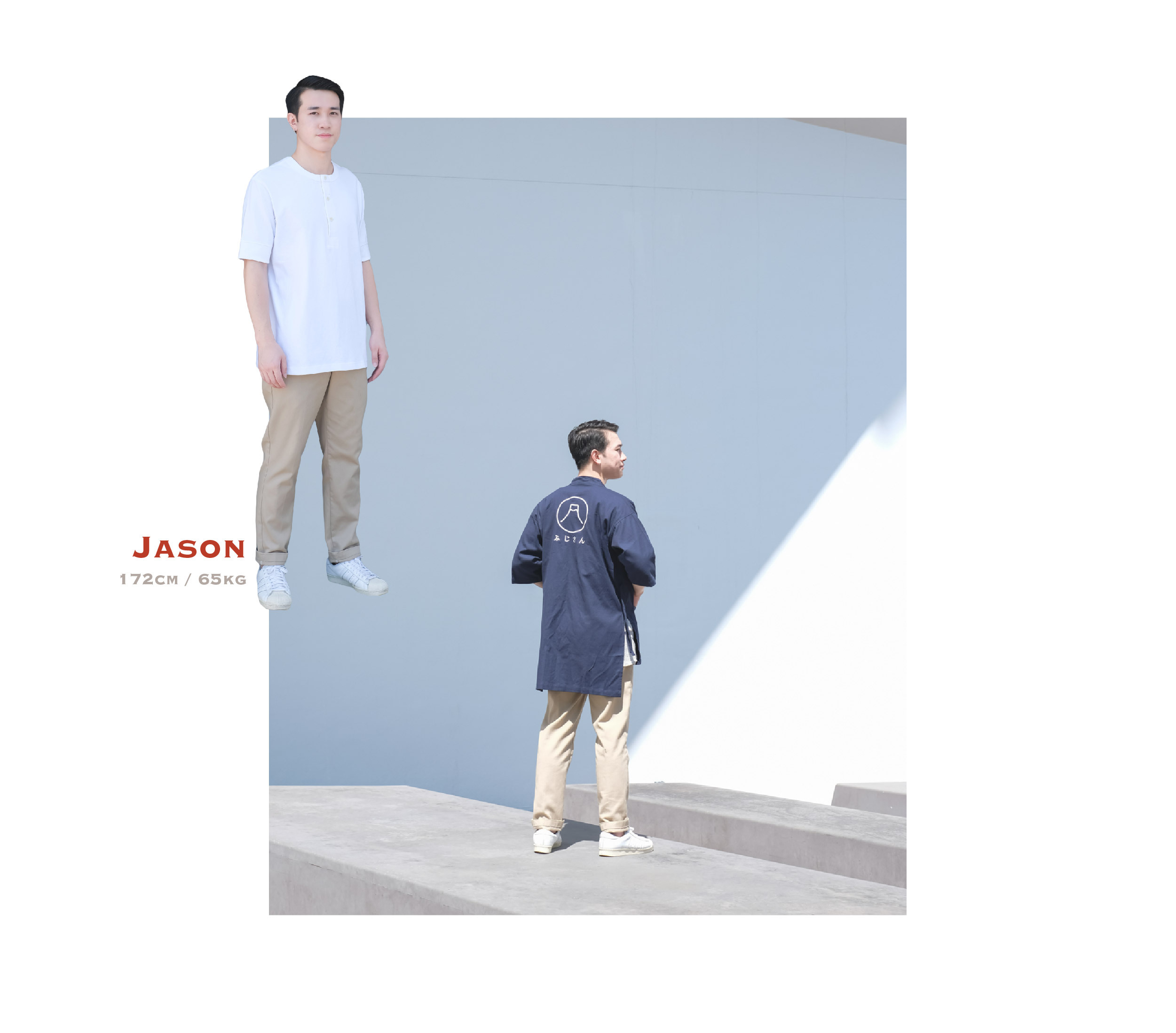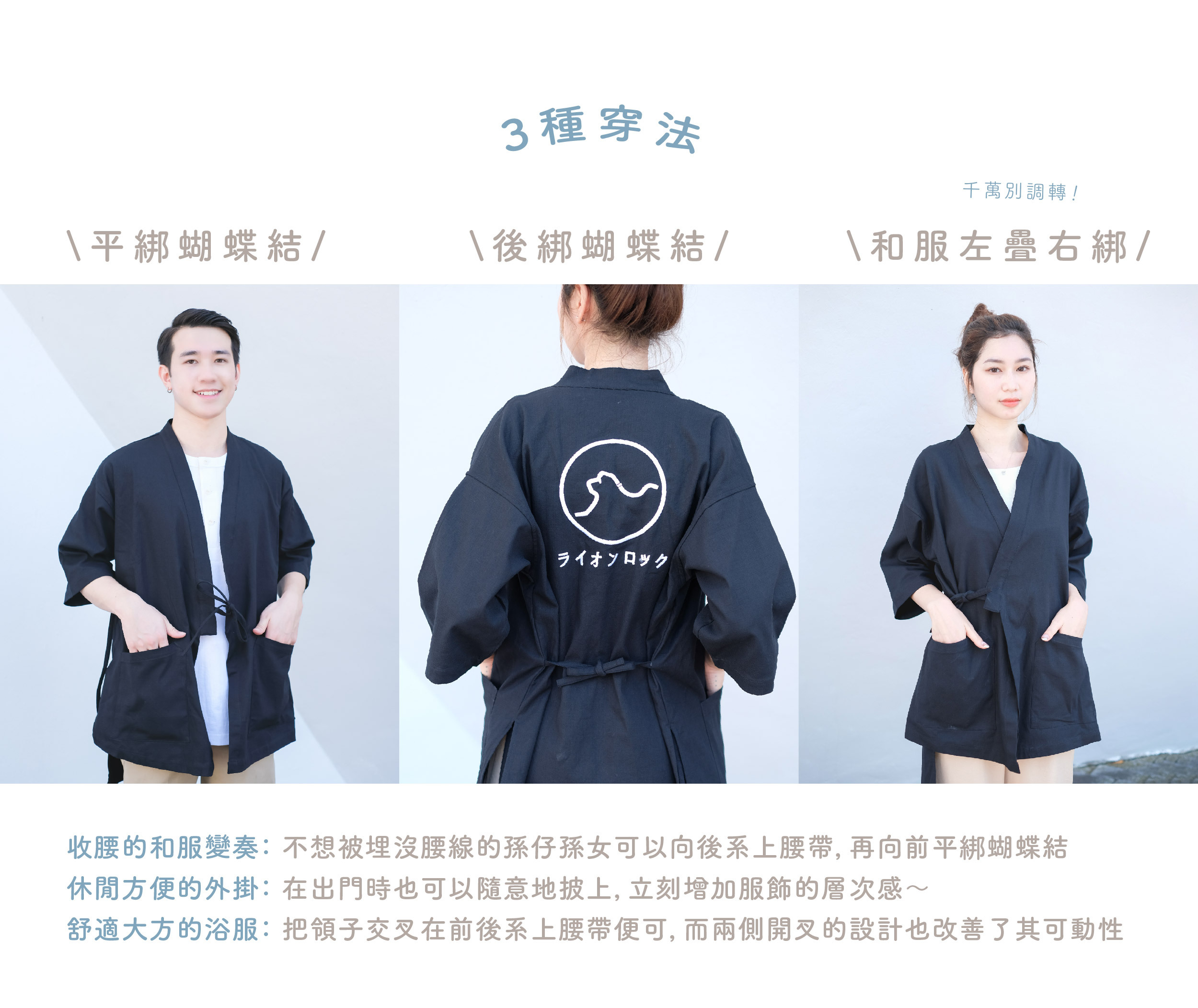 Kamon和風家紋外套把經典職人服野良着(のらぎ)的剪裁融入設計,加上自家設計的Kamon Logo刺繡,重現日本傳統工作服飾。配合寬鬆衣身、開放式前襟、長條形領片和七分袖等野良著的特點,加上兩側開叉的時尚設計,新舊交融,適合都市人穿著。