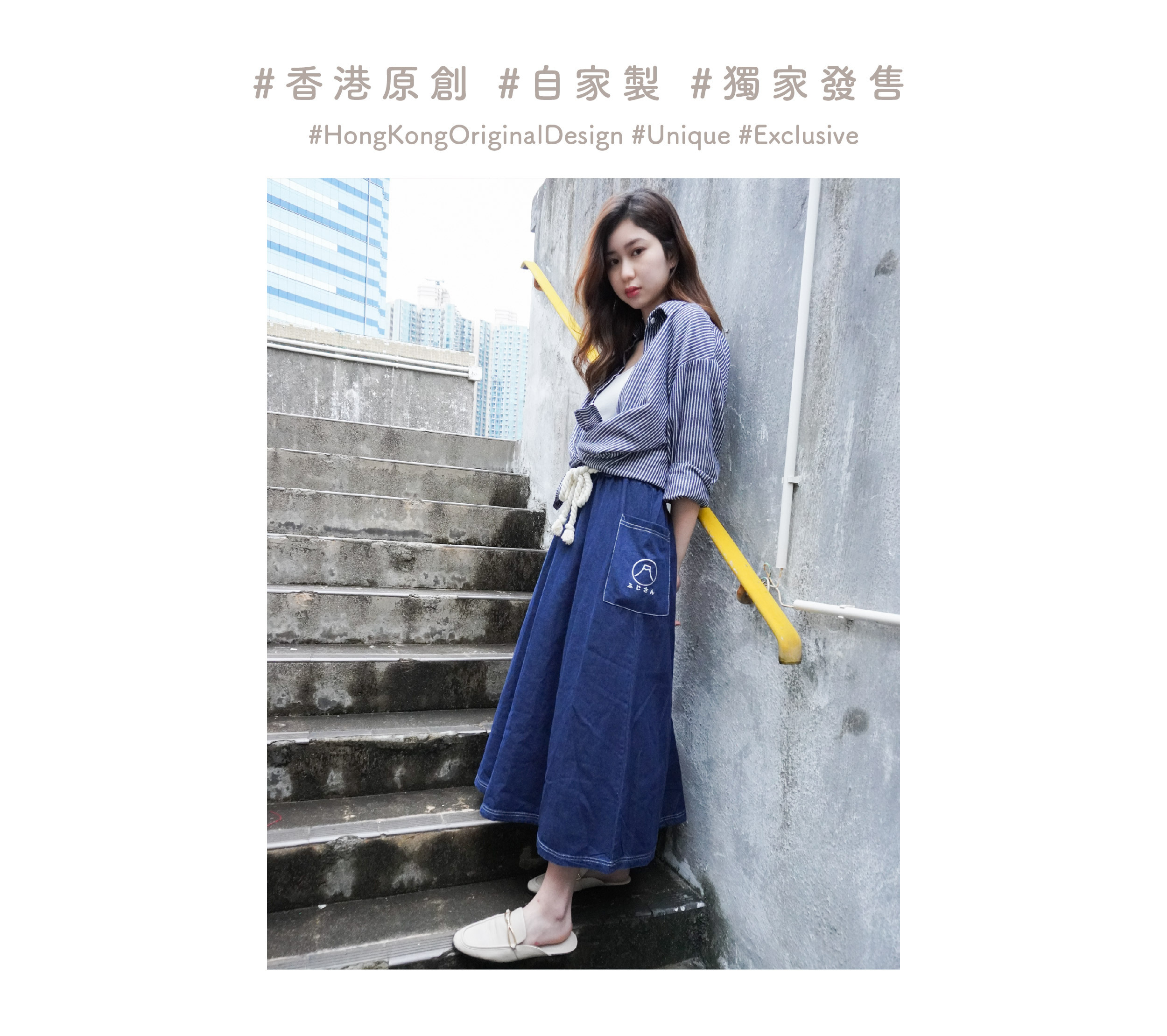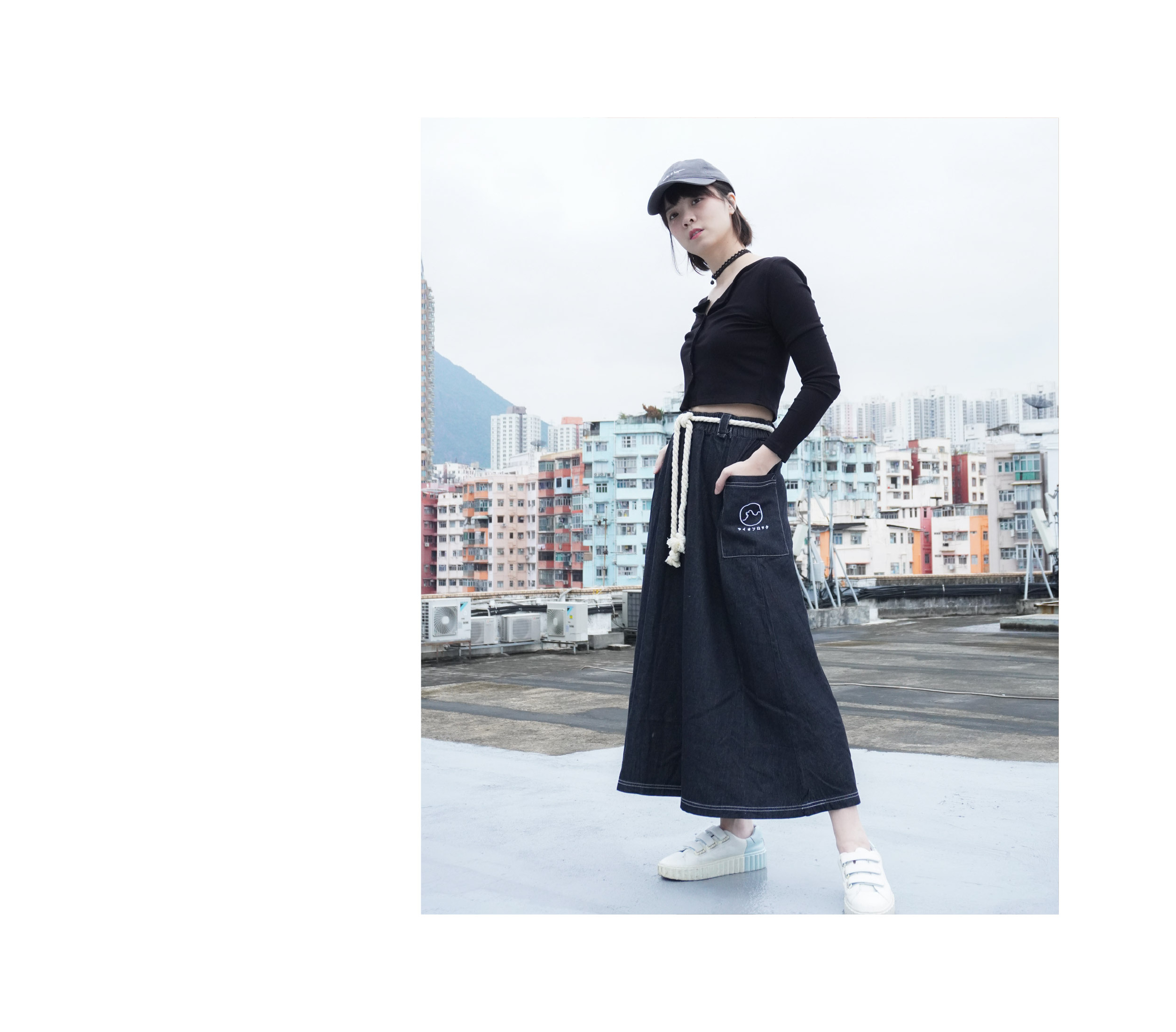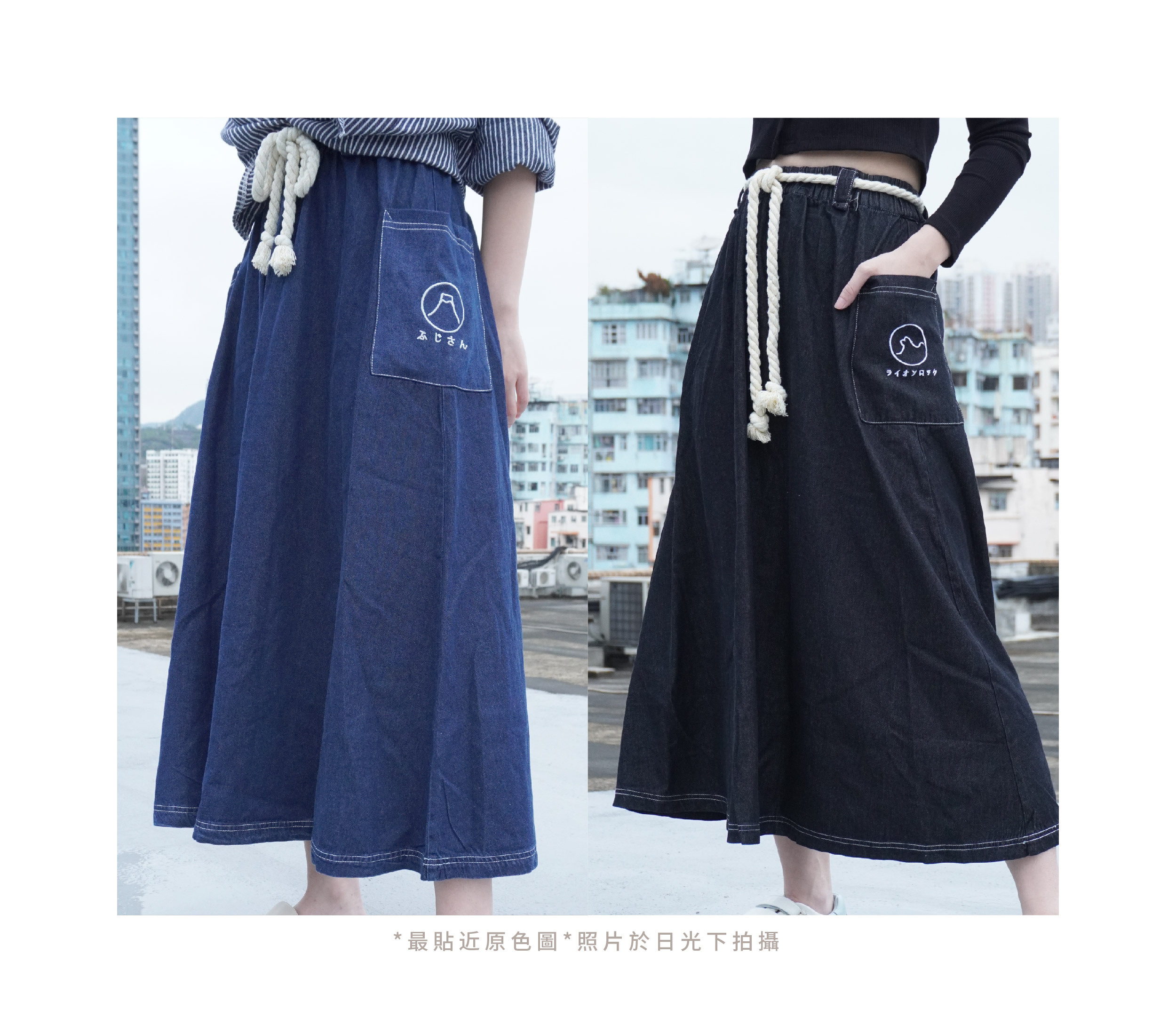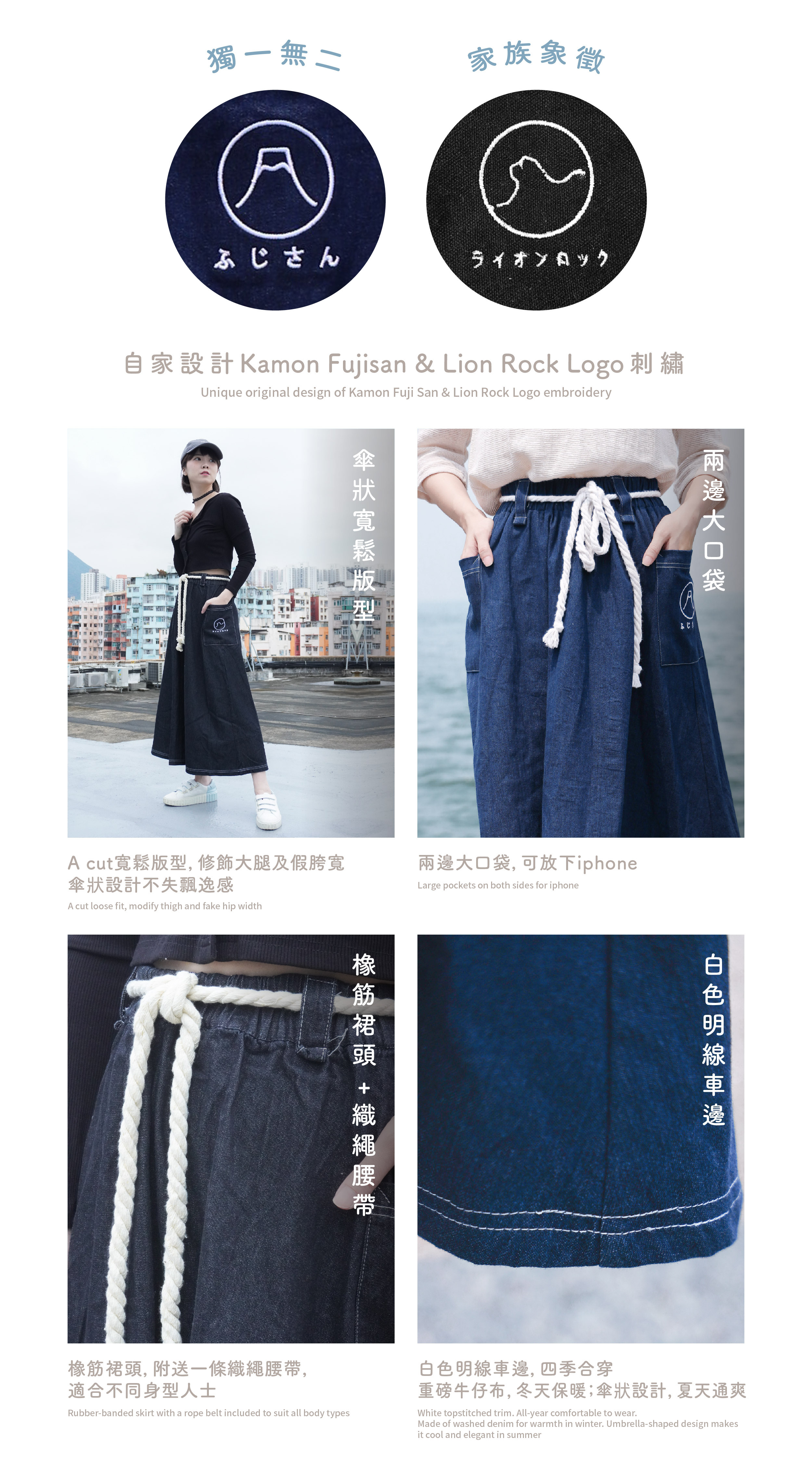 Kamon is the meaning of family crest. It is marked by Japanese aristocratic disciples to represent their possessions. As a symbol of the family, it later evolved to identify personal identity. Hong Kong people identify themselves through the spirit of Lion Rock. At the same time, we love Japanese culture, also cherish the beauty of Mount Fuji. For this Kamon series, Lion Rock and Mount Fuji are used as our "family crests", and high-quality denims are used in our homemade product - Kamon Denim Skirt.