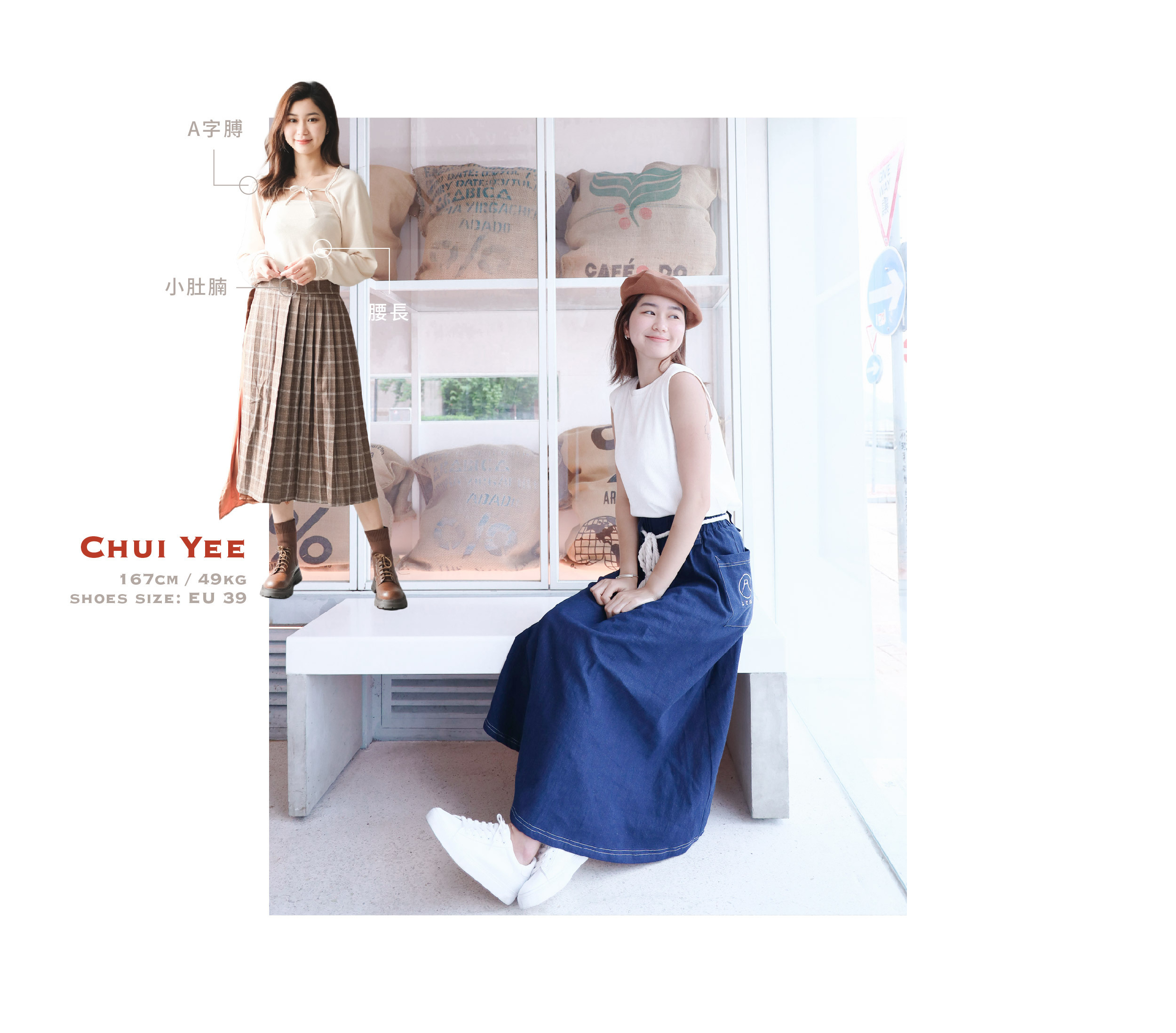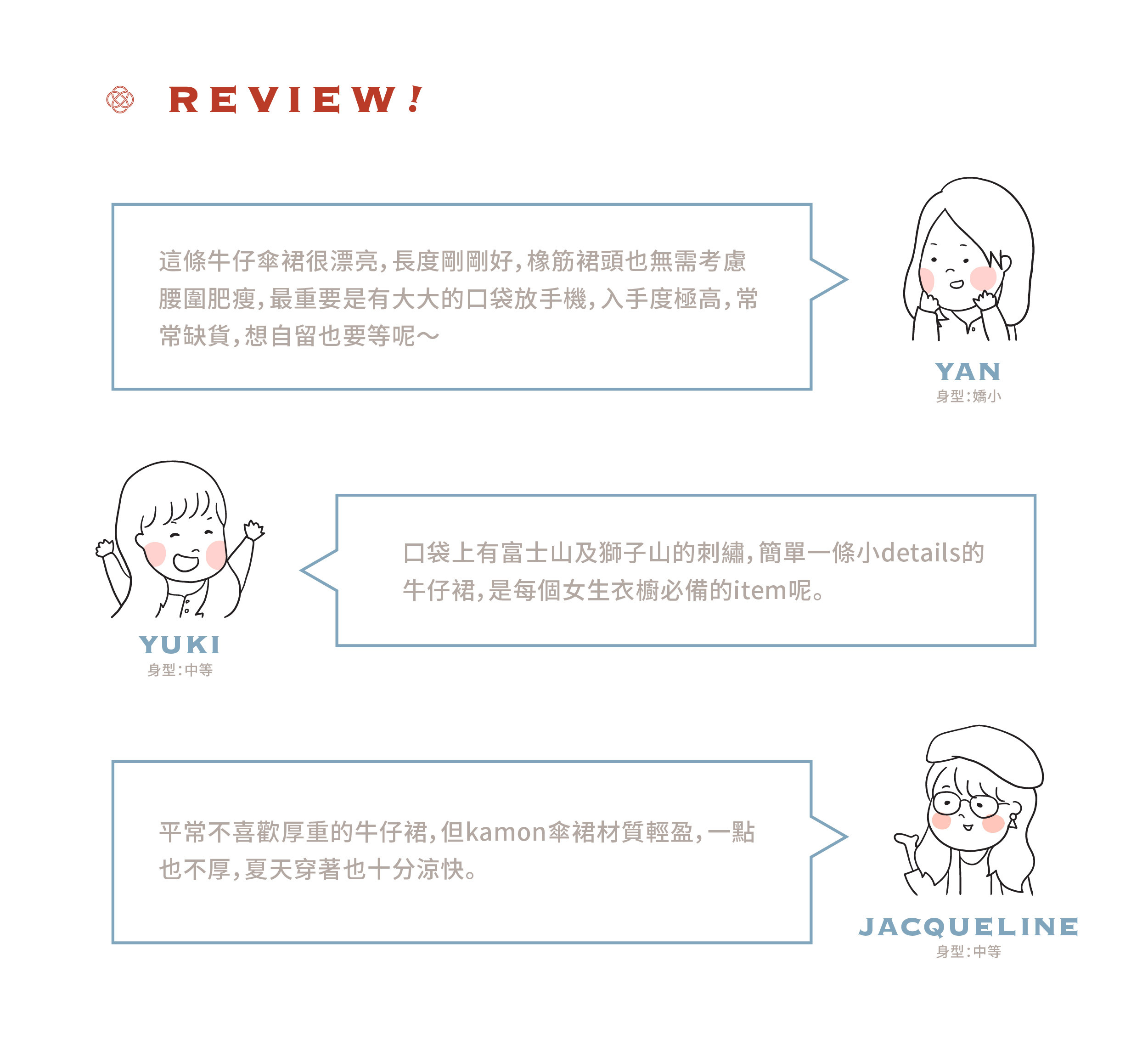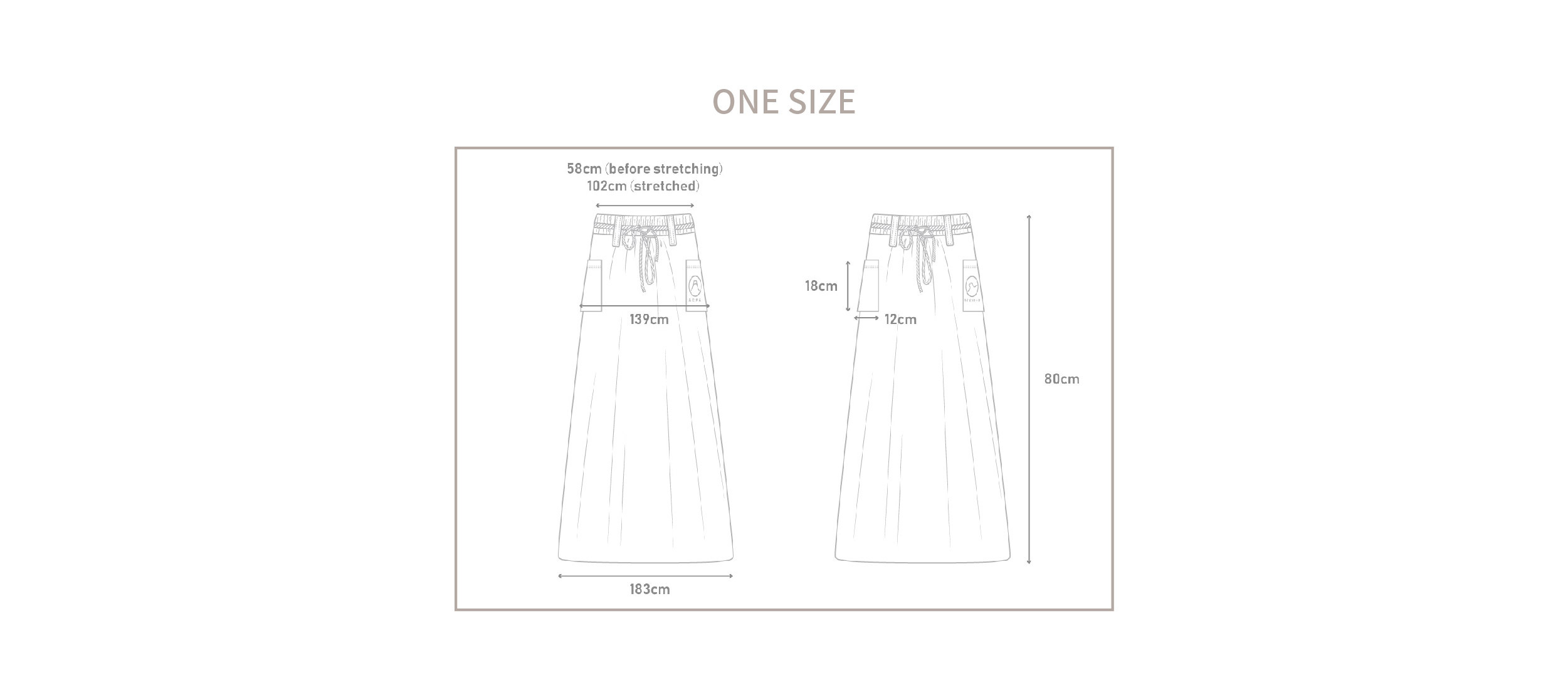 裙頭用橡筋車縫,富有彈性,無論大中小碼的你都合身,加上傘型裁剪,能好好修飾大腿及假胯寬問題。白色棉繩,以及口袋上的明線家紋圖案,為簡單的裙子作出點綴。