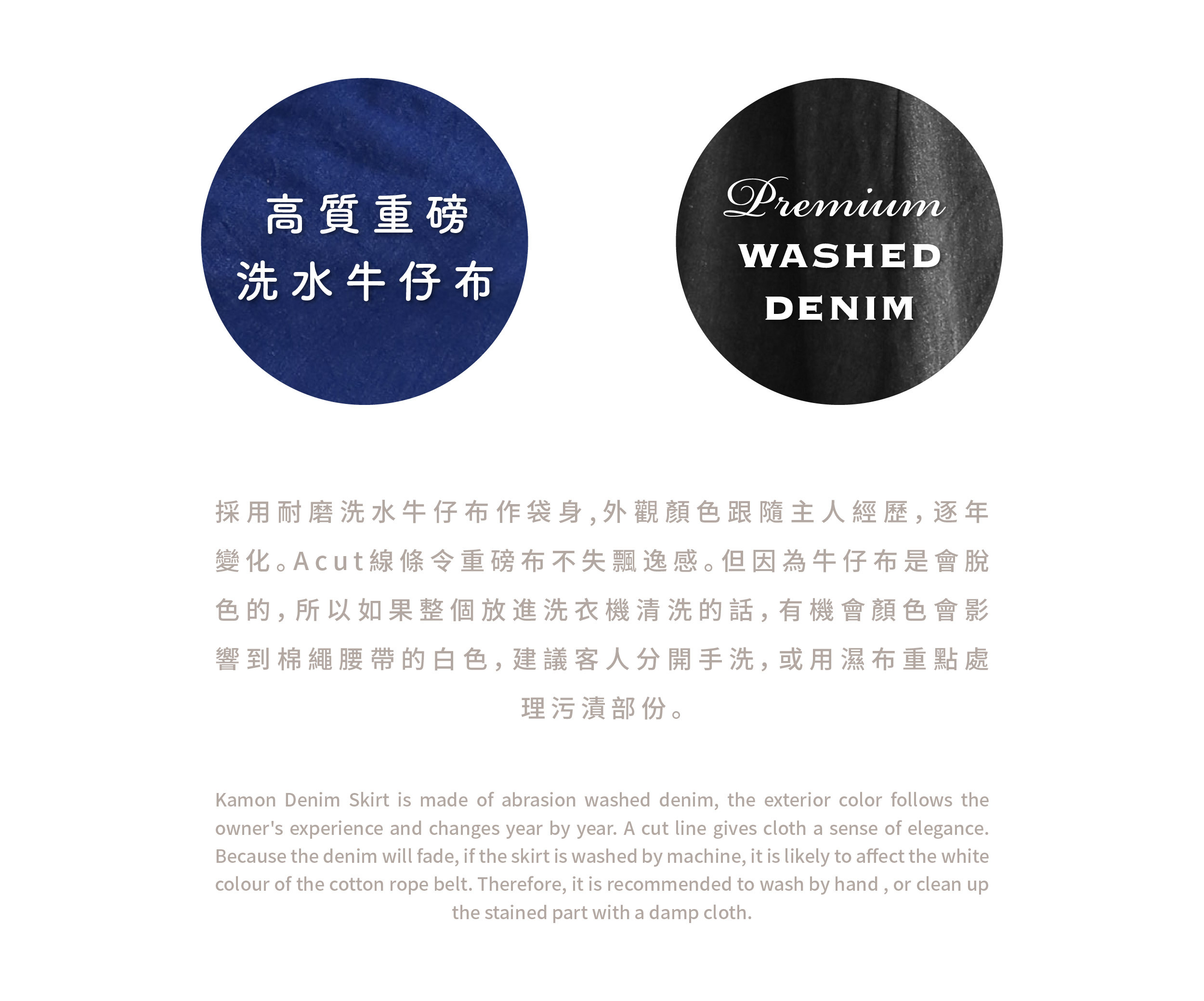 使用高質重磅洗水牛仔布,外觀顏色跟隨主人經歷,逐年變化。A cut線條令重磅布不失飄逸感。