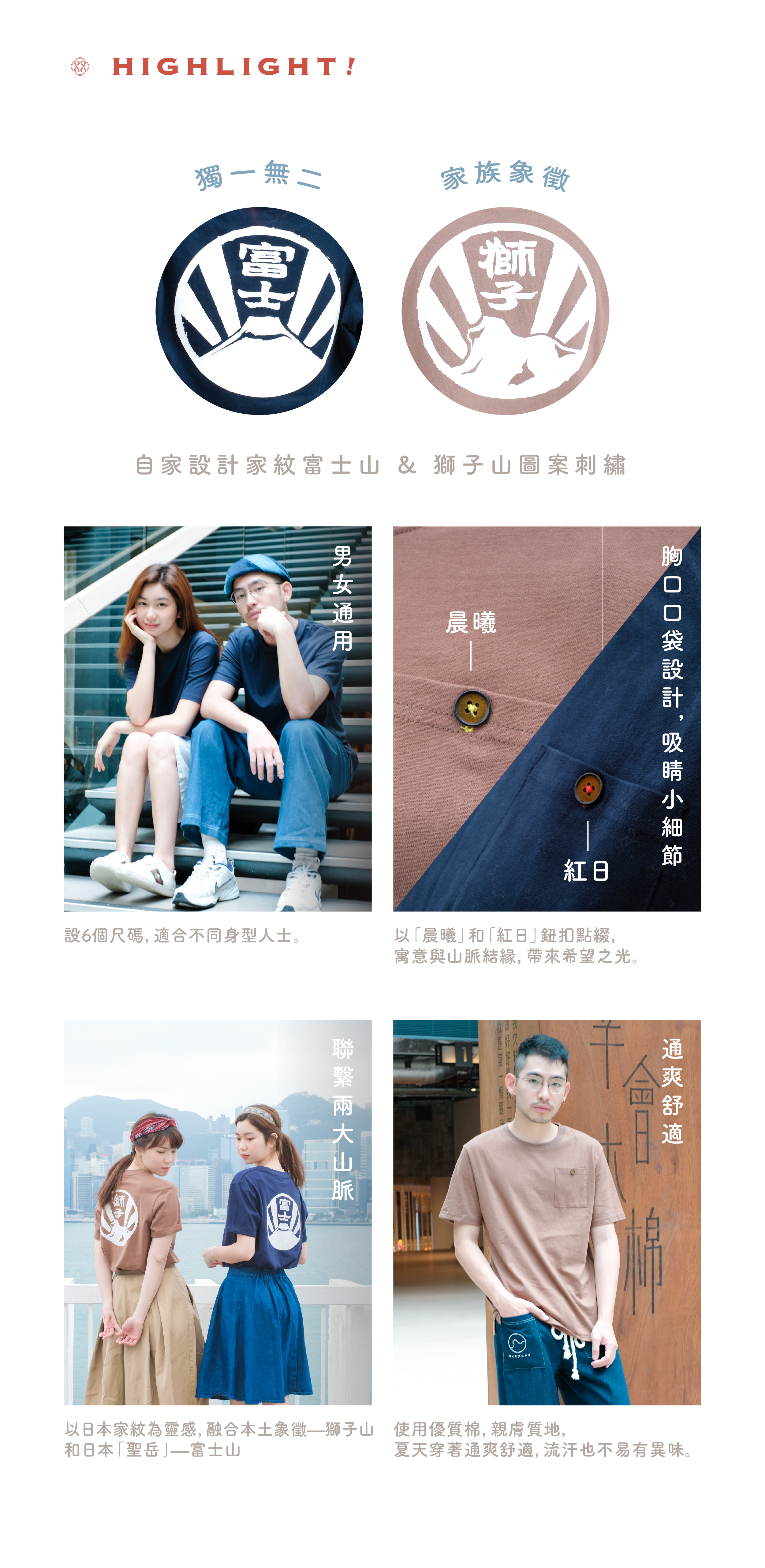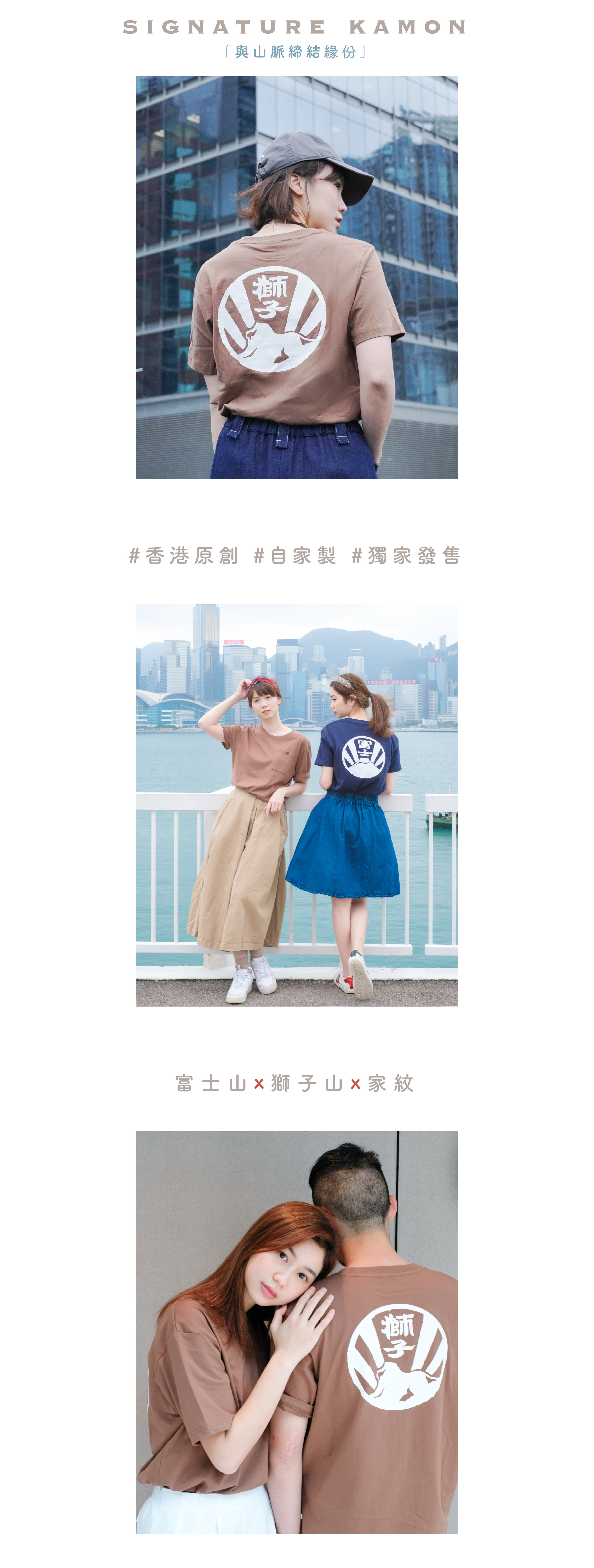本系列以日本家紋(かもん )為靈感,融合本土象徵—獅子山和日本「聖岳」—富士山,推出兩款Kamon家紋自家設計Tee。使用優質棉,親膚質地,夏天穿著通爽舒適,流汗也不易有異味。