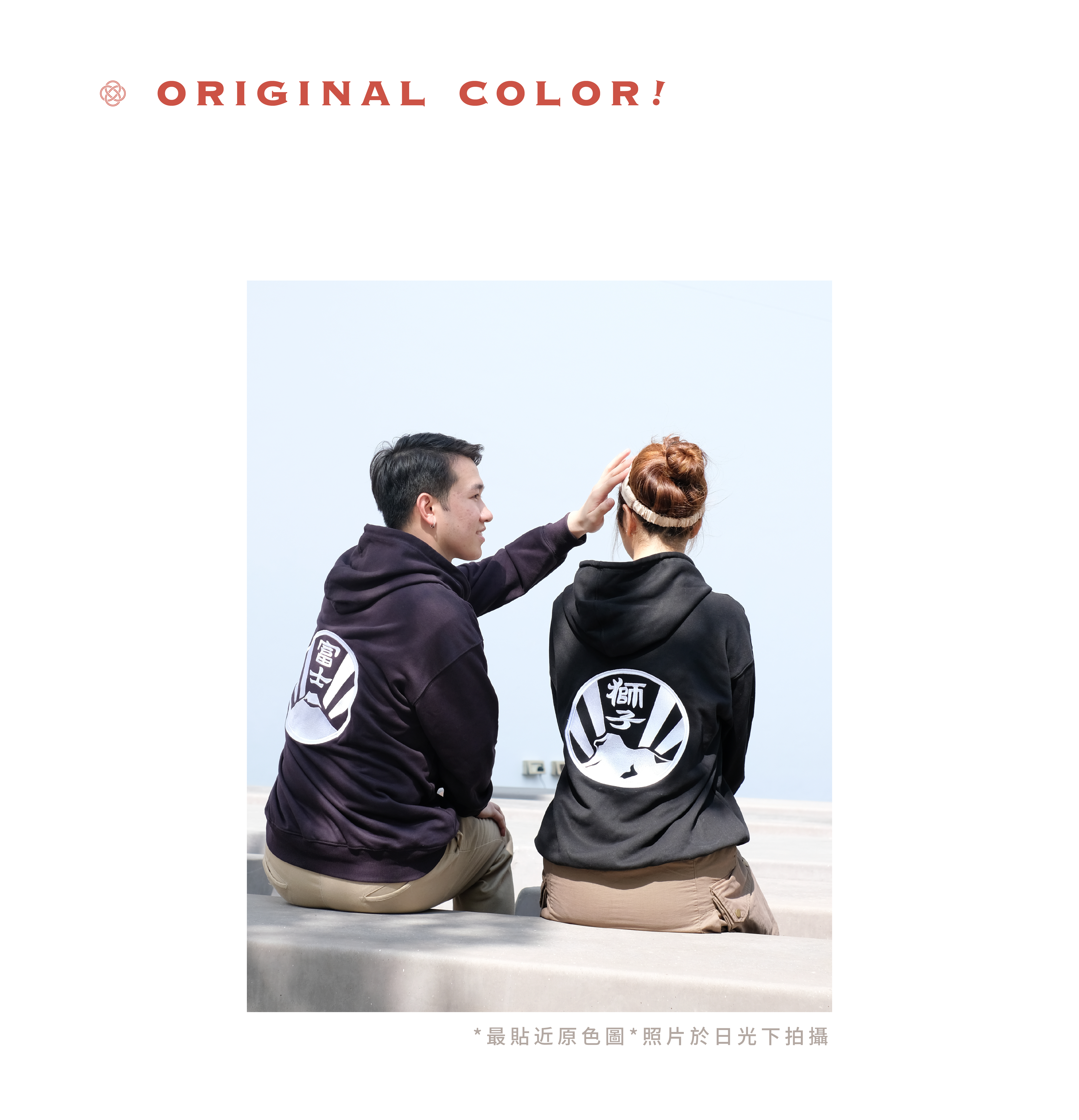 陽光明媚的日子散發著正能量,富士山背後徐徐升起的紅日;金光燦爛的晨曦灑滿獅子山,Kamon家紋衛衣上的紅黃點綴,如紅日、如晨曦、帶來希望之光。