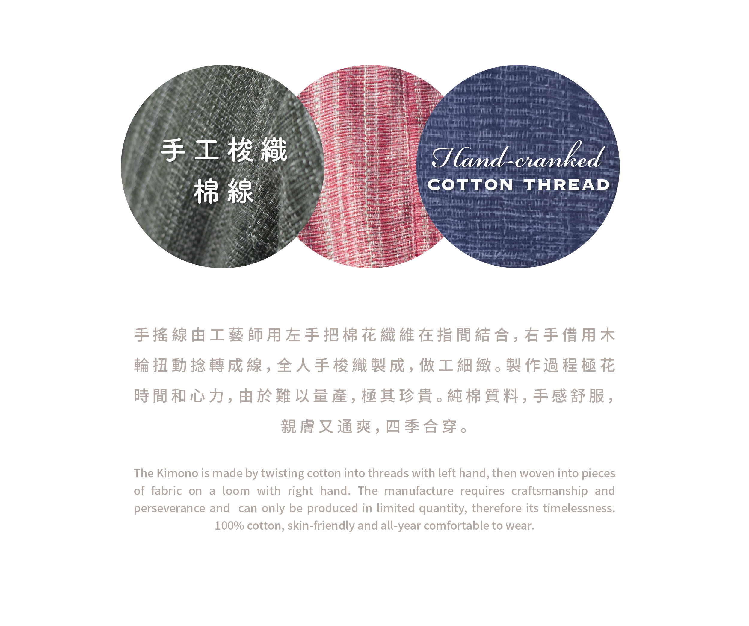 這款手搖線和風外套以月夜藍和黑色配搭,顏色素雅,百搭易襯,完美展現日系和風的版型,配以七分袖及寬鬆的設計,修飾身型之餘還增添自然隨性的感覺,集風情文化潮流於一身。 手搖線由棉花搓捻成線,全人手梭織製成,做工細緻。製作過程極花時間和心力,由於難以量產,極其珍貴。