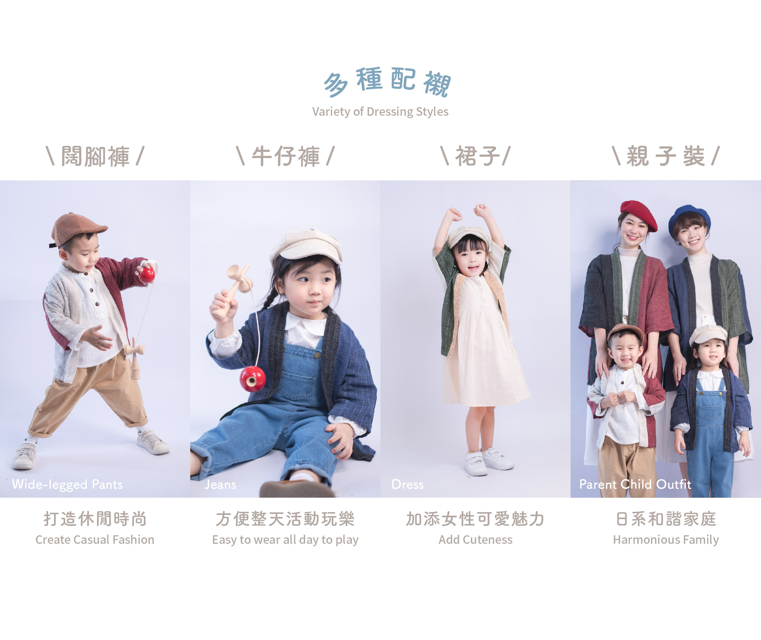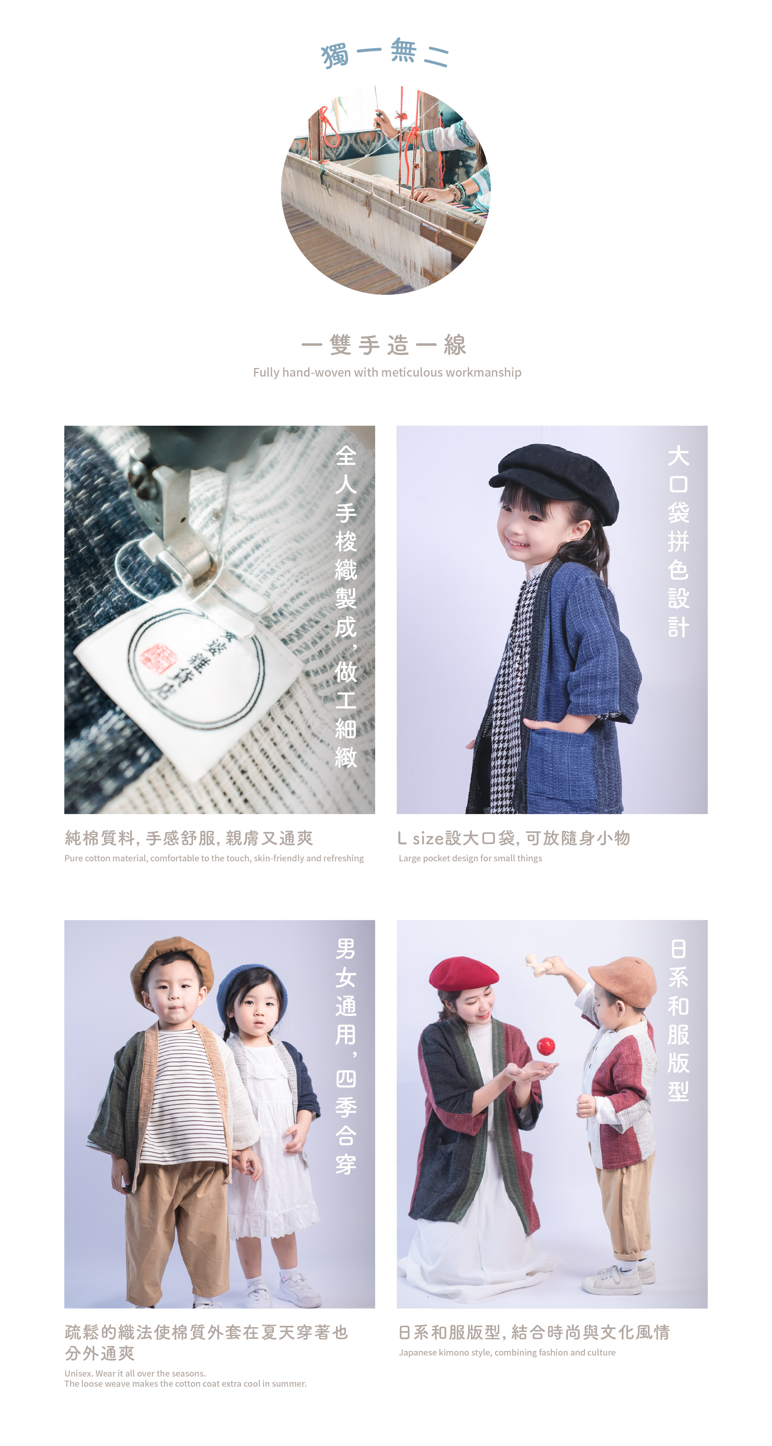 Grandmama launches a series of Handmade Kids Kimono, injecting children's vitality into each finished product and witnessing their growth at the same time. The Kimono is made by twisting cotton into threads with left hand, then woven into pieces of fabric on a loom with right hand. The unique combination of multi-colour threads form a mixed-colour cotton fabric, and its loose weave makes you feel extra cool in summer and very suitable in winter. Each child is precious, just as the colour of each thread varies slightly depending on the angle or speed of twisting. Grandmama hopes to pass on the love of her family through the warmth of her handiwork.