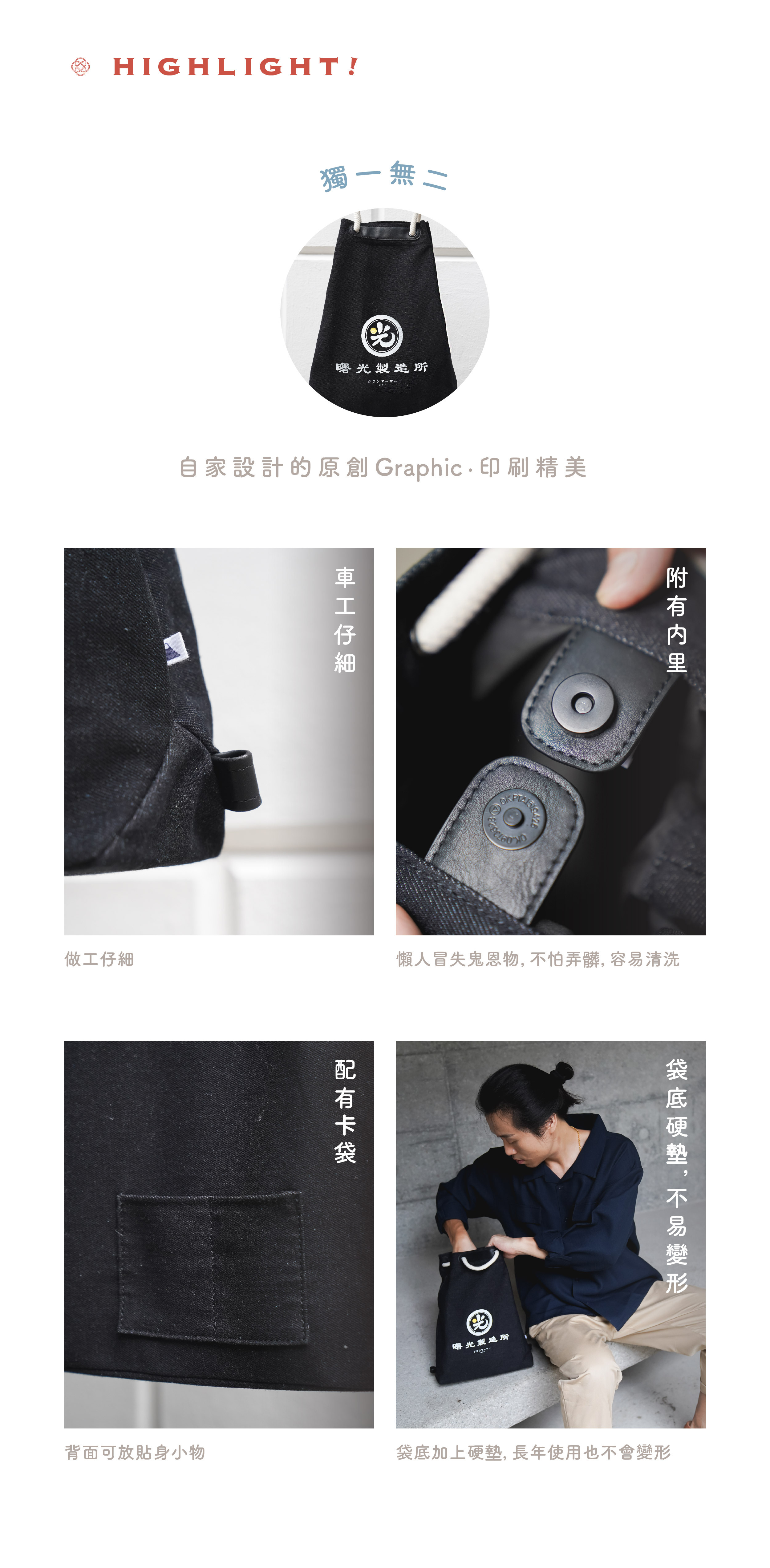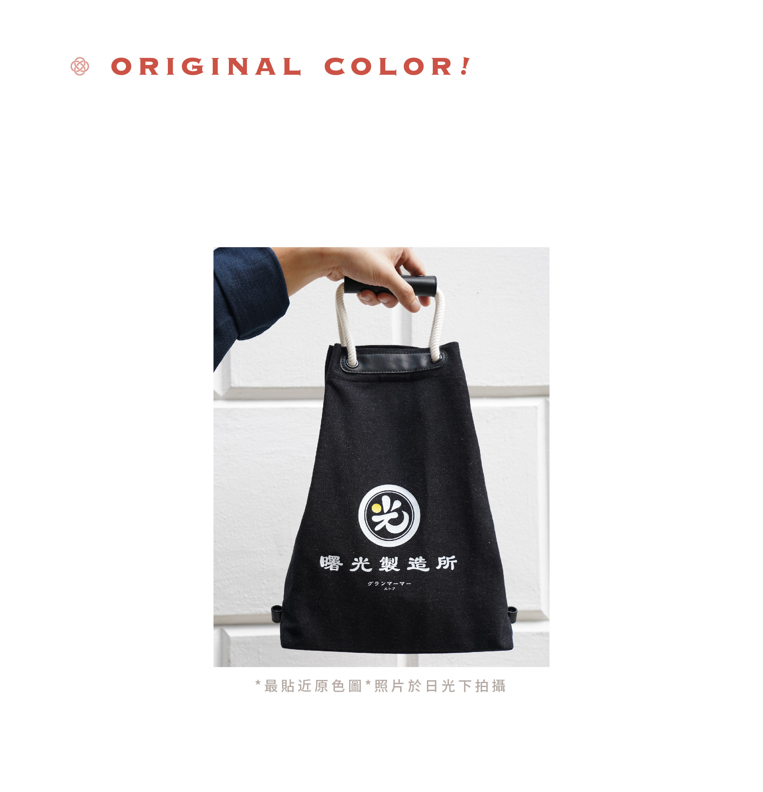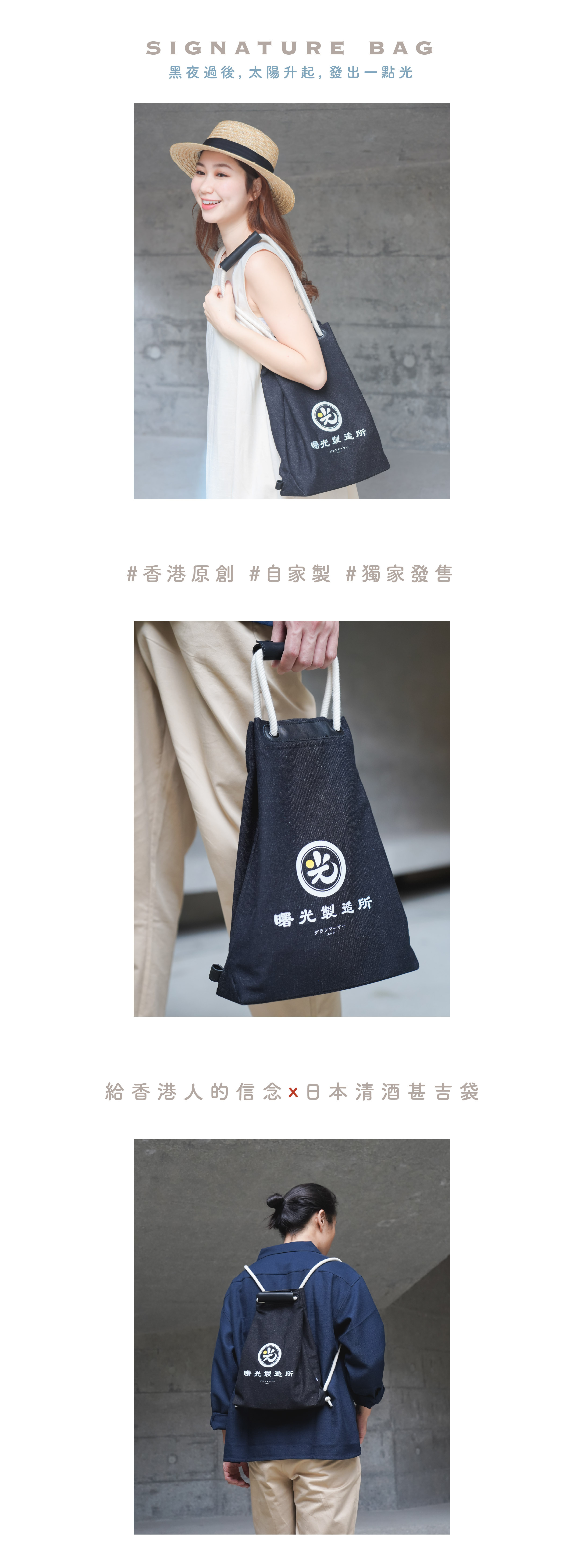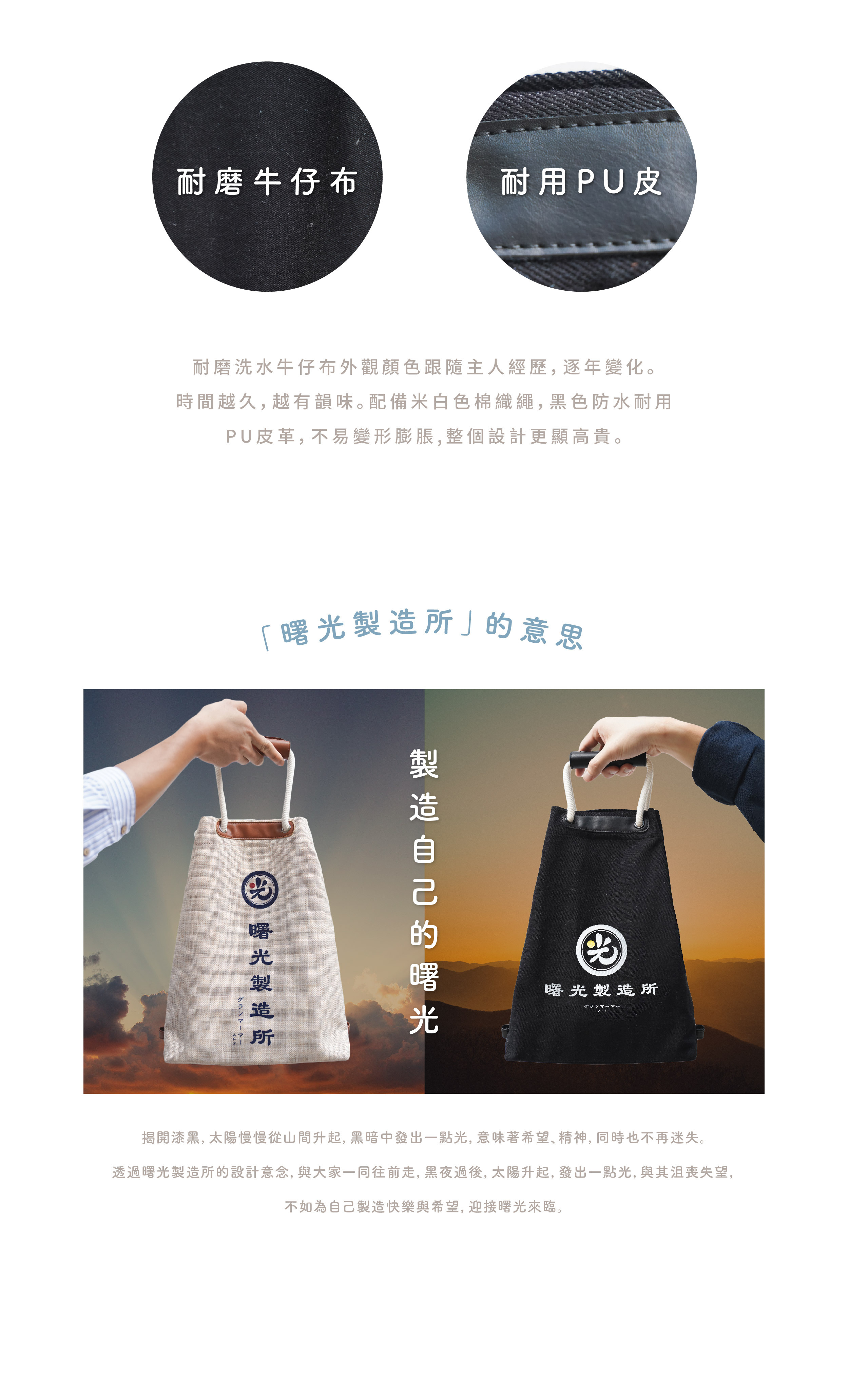 黑色的耐磨洗水牛仔布,印著白色的曙光製造所,告訴你黑暗中還是有光,有一點曙光仍是有希望;配備米白色棉織繩,黑色防水耐用PU皮革,不易變形膨脹,整個設計更顯高貴。