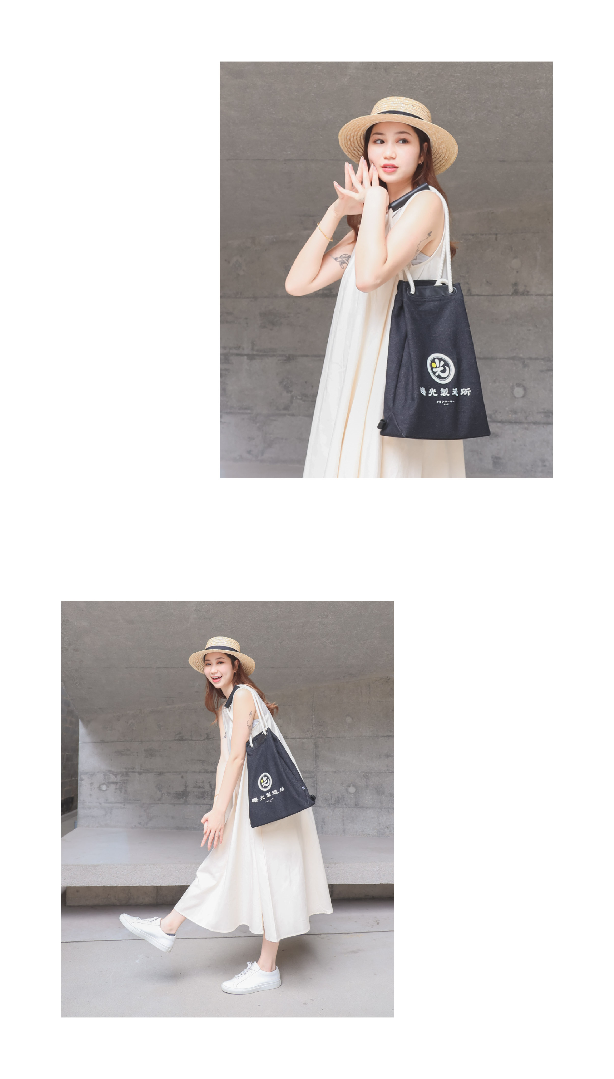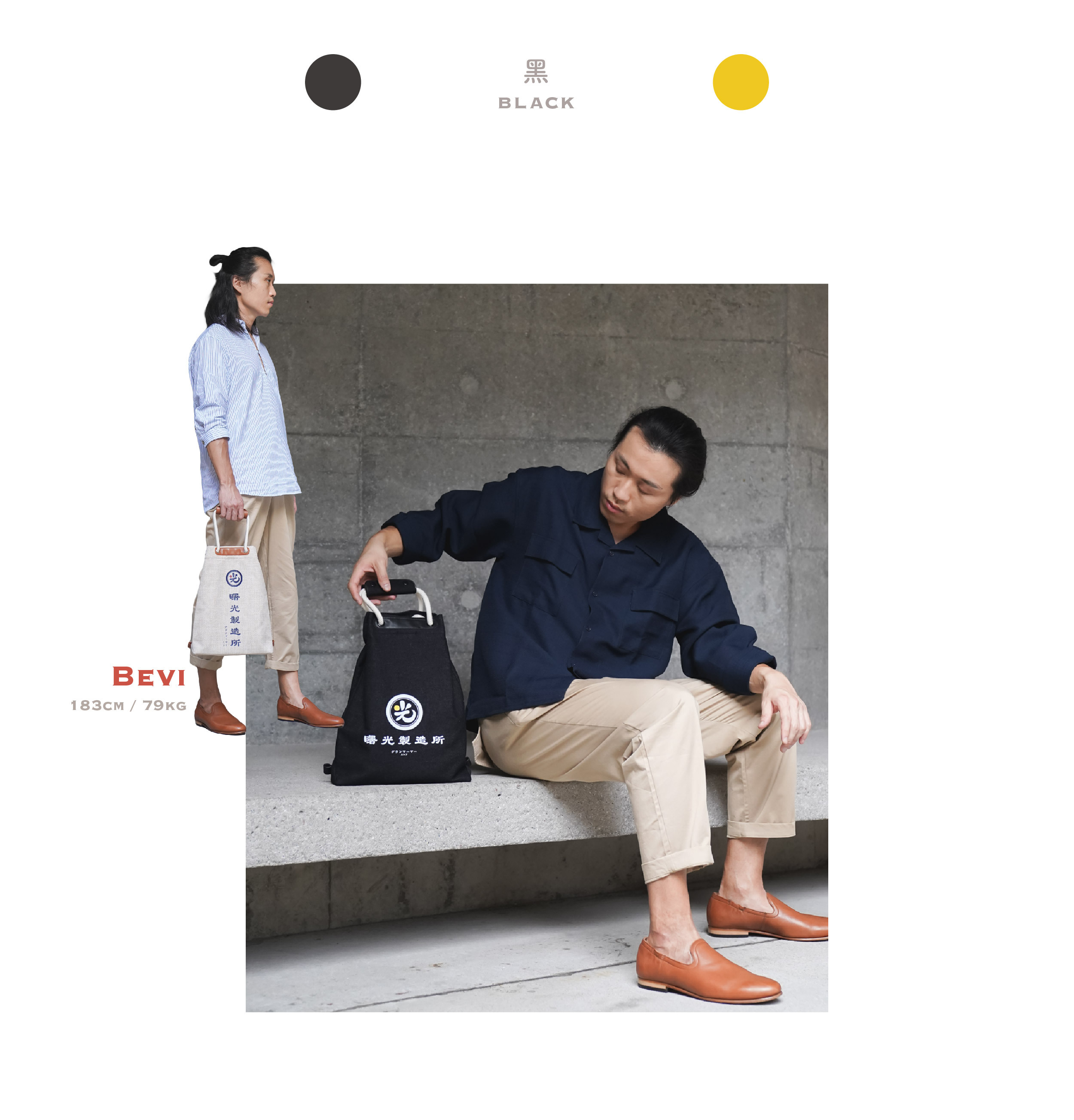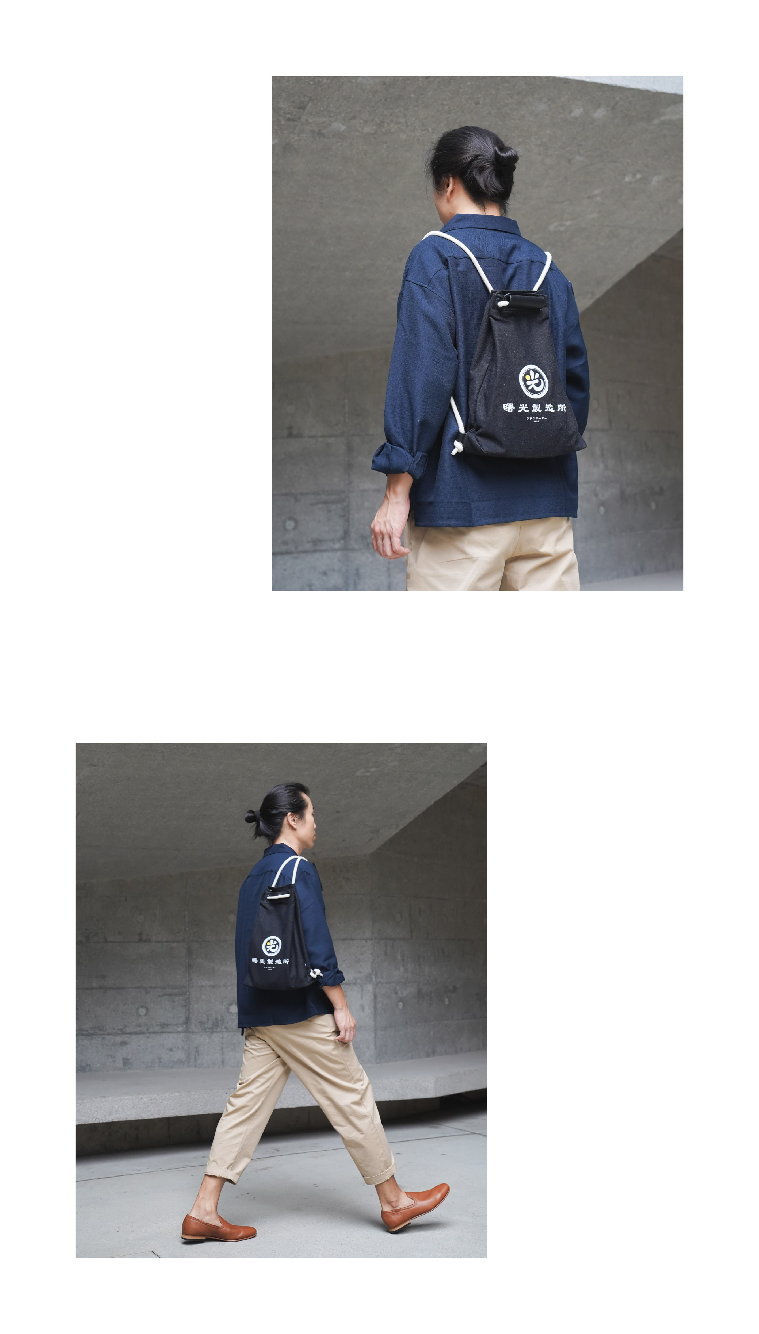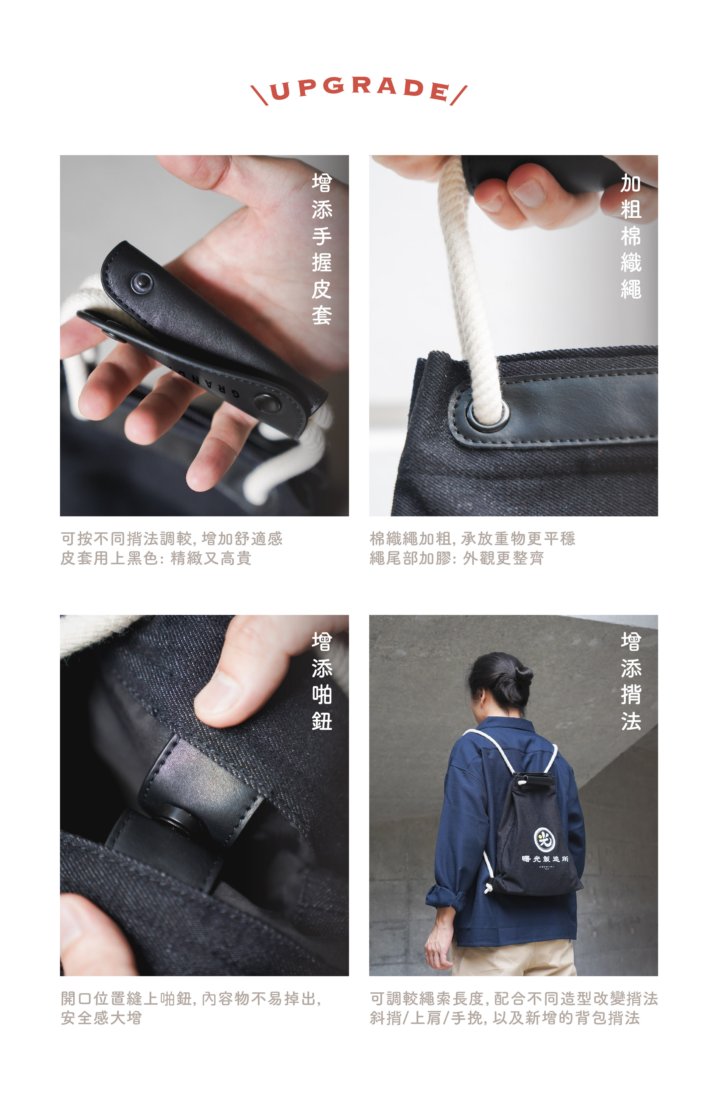 黑色的耐磨洗水牛仔布,印著白色的曙光製造所,告訴你黑暗中還是有光,有一點曙光仍是有希望;配備米白色棉織繩,黑色防水耐用PU皮革,不易變形膨脹,整個設計更顯高貴。