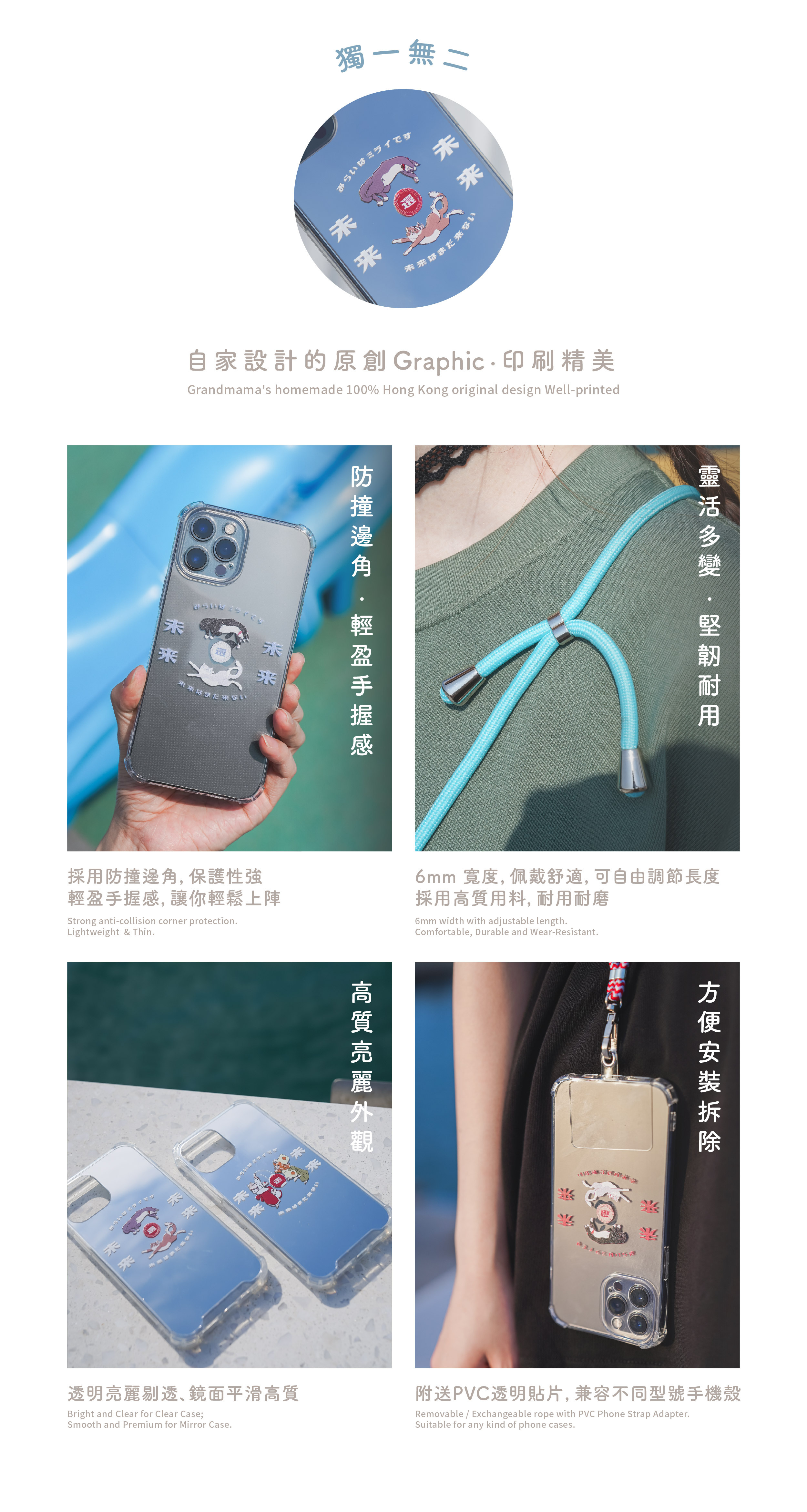 手機掛繩方便攜帶和拆除,在拿著食物、雨傘時不會手忙腳亂,更重要是不會錯過最佳的拍照時刻!