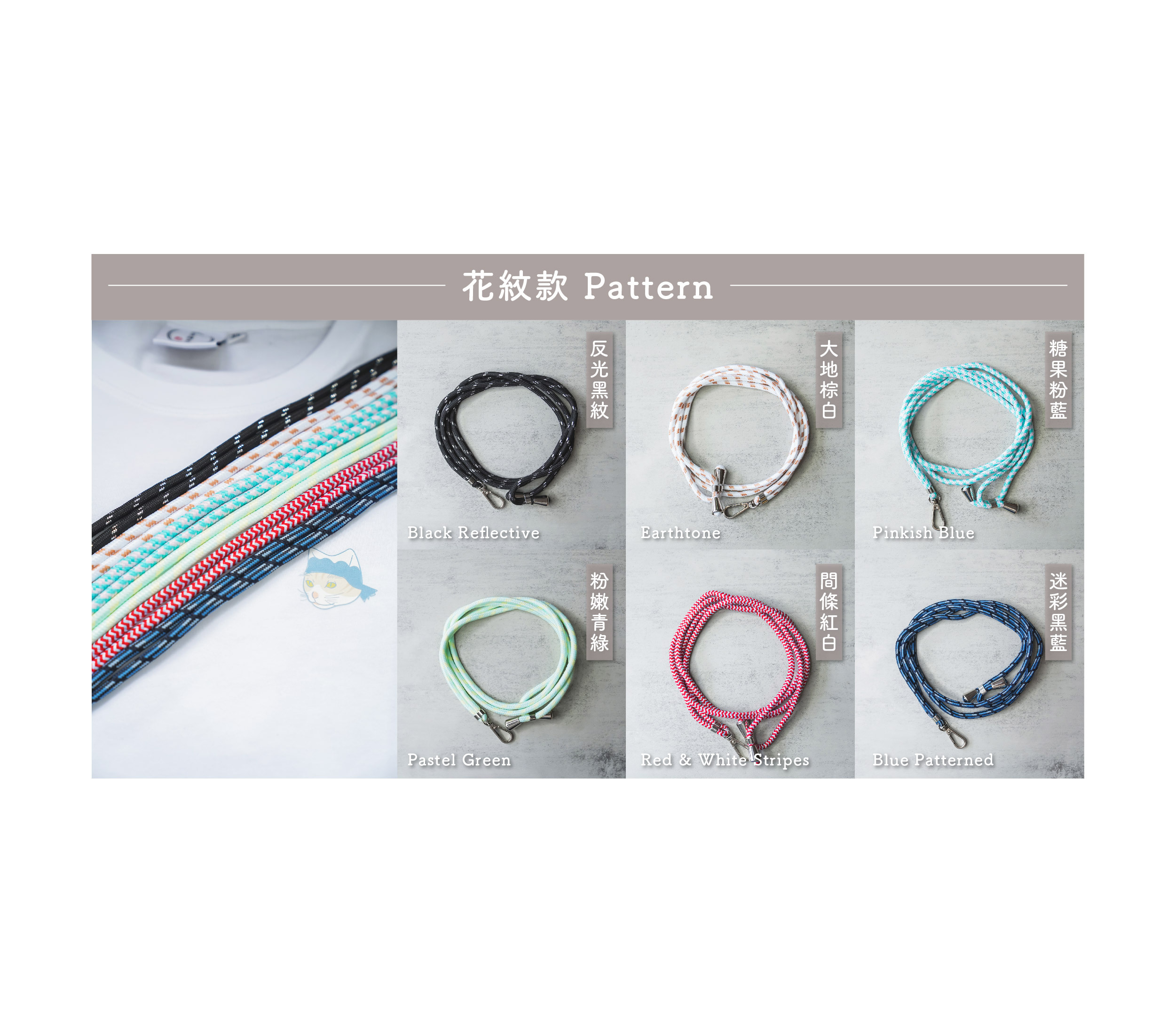 .反光黑紋 Black Reflective | 迷彩黑藍 Blue Patterned | 粉嫩青綠 Pastel Green | 糖果粉藍 Pinkish Blue | 大地棕白 Earthtone | 間條紅白 Red & White Stripes