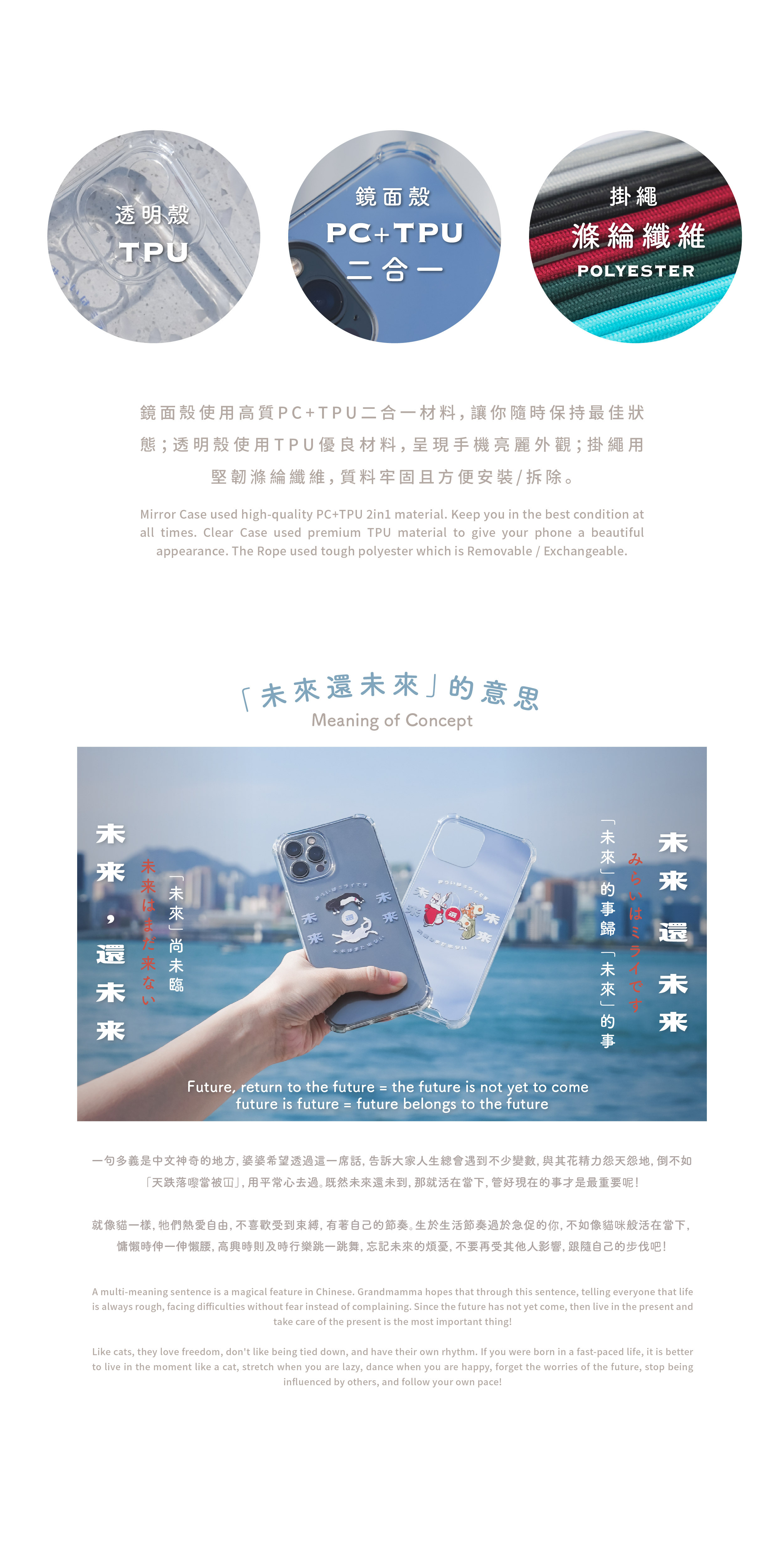 鏡面殼使用高質PC+TPU二合一材料,讓你隨時保持最佳狀態;透明殼使用TPU優良材料,呈現手機亮麗外觀;掛繩用堅韌滌綸纖維,質料牢固且方便安裝/拆除。