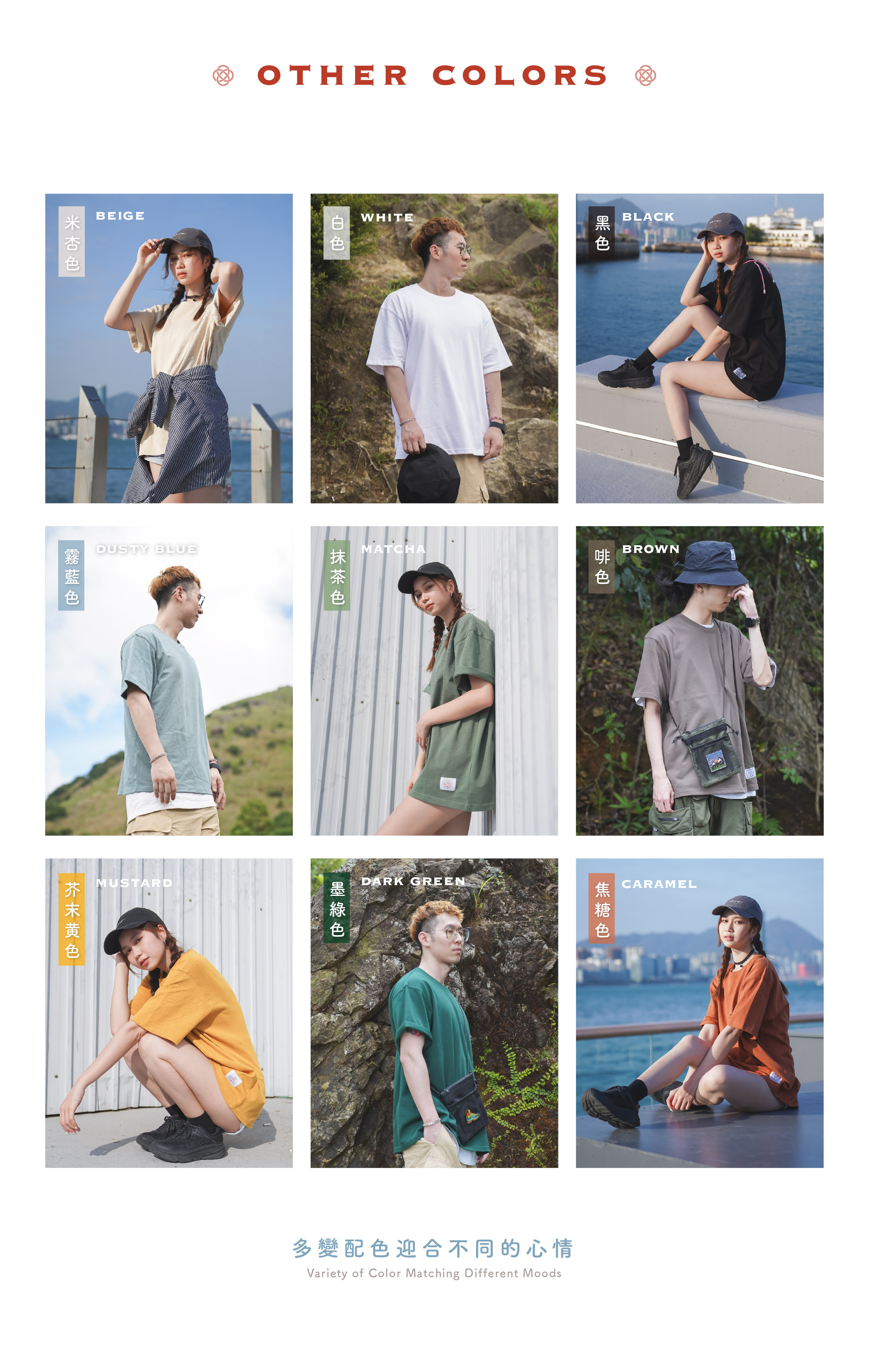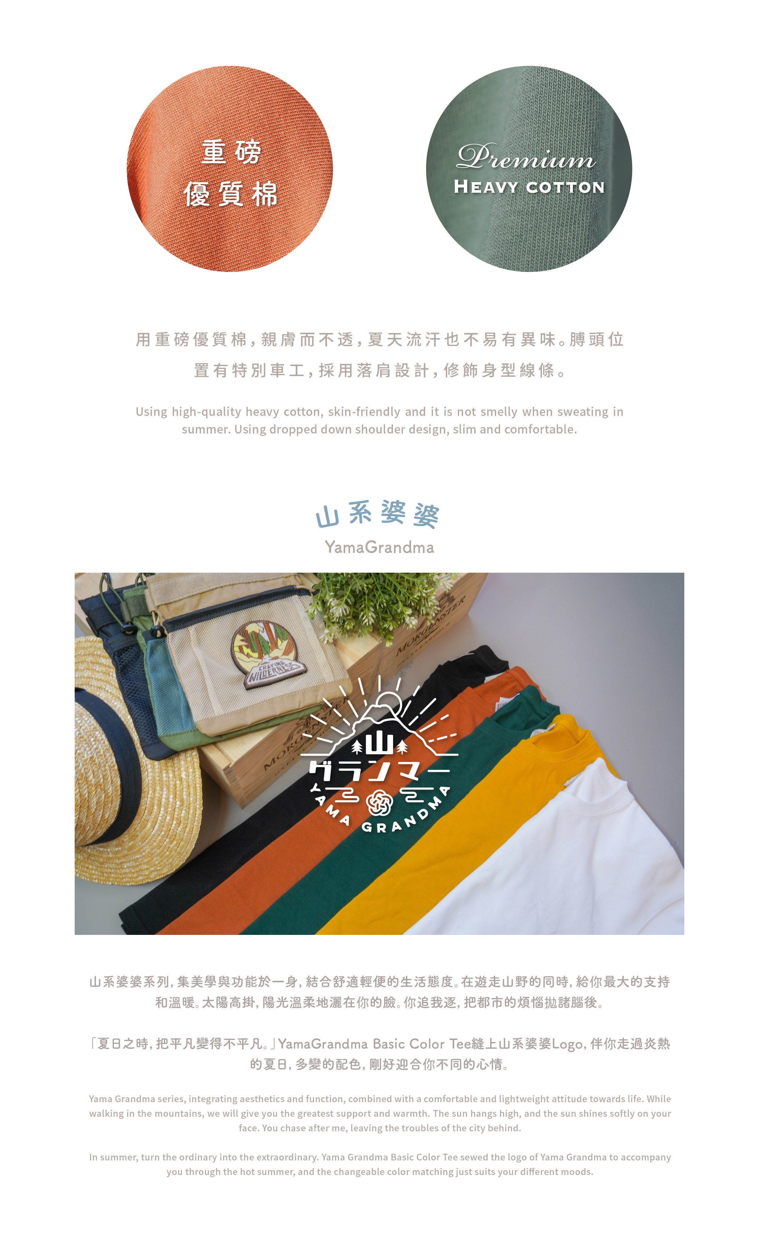 Yama Basic Color Tee縫上山系婆婆Logo,為平凡素色的Tee帶來不平凡;伴你走過炎熱的夏日,多款的消暑色系,迎合你不同的心情。